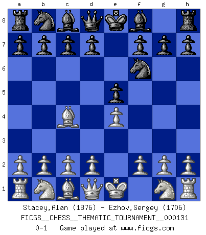 Last move : 0-1 2011 June 23 8:0:58 [Event "FICGS__CHESS__THEMATIC_TOURNAMENT__000131"] [Site "FICGS"] [Date "2011.05.13"] [Round "1"] [White "Stacey,Alan"] [Black "Ezhov,Sergey"] [Result "0-1"] [WhiteElo "1876"] [BlackElo "1706"] 1.e4 e5 2.Bc4 Nf6 0-1 This chess game has been lost on time (started : 2011.05.13 21:5:15) Bishop's Opening : Berlin defense Player Black won this chess game. Follow this game move after move (download)Bobby Fischer is the greatest Chess player who has ever lived. (Ken Smith) Ich würde mich als ganz normalen Jungen bezeichnen [Im Alter von 12]. (Sergej Karjakin) El Ajedrez es una manera fabulosa para que los niños aprendan a autovalorarse y a autoestimarse. (Saudin Robovic) Même un GMI sait rarement calculer sur plus de cinq coups une attaque à sacrifices. (Rudolf Spielmann) For a mechanic, you seem to do an excessive amount of thinking. (C-3PO in Star Wars ep.2)