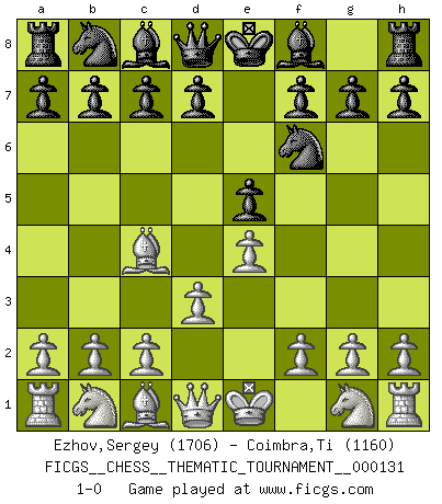 Last move : 1-0 2011 June 23 8:0:58 [Event "FICGS__CHESS__THEMATIC_TOURNAMENT__000131"] [Site "FICGS"] [Date "2011.05.13"] [Round "1"] [White "Ezhov,Sergey"] [Black "Coimbra,Ti"] [Result "1-0"] [WhiteElo "1706"] [BlackElo "1160"] 1.e4 e5 2.Bc4 Nf6 3.d3 1-0 This chess game has been lost on time (started : 2011.05.13 21:5:15) Bishop's Opening : Berlin defense Player White won this chess game. Follow this game move after move (download)Chess is everything: art, science and sport. (Anatoly Karpov) Darum geht es im Schach. Einen Tag gibst du deinem Gegner eine Lektion, am nächsten Tag gibt er dir eine. (Robert James Fischer) Fischer deseaba darle a los Rusos una sopa de su propia medicina. (Larry Evans) A chaque perte on perd un peu de soi. (Joël Lautier) If you have any trouble condescending, find a Unix user to show you how it's done. (Scott Adams)