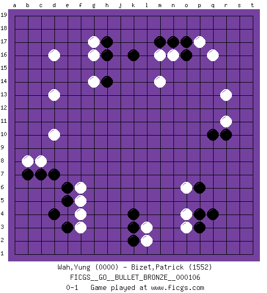 Last move : 0-1 2011 May 14 14:45:21 [Event "FICGS__GO__BULLET_BRONZE__000106"] [Site "FICGS"] [Date "2011.05.14"] [Round "1"] [Black "Wah,Yung"] [White "Bizet,Patrick"] [Result "0-1"] [Rating 1 "0000"] [Rating 2 "1552"] 1.q4 d16 2.d4 q16 3.k16 d10 4.q10 r13 5.o16 m16 6.m17 n16 7.n17 p17 8.o17 g17 9.h17 g16 10.h16 d13 11.k4 o3 12.p3 o4 13.p4 l3 14.k3 l2 15.k2 o6 16.p6 f3 17.e3 f4 18.e5 f5 19.e6 f6 20.d7 c8 21.c7 b8 22.b7 r11 23.r10 g14 24.h14 m14 0-1 This go game has been lost on time (started : 2011.05.14 14:25:37) Here are the names of the openings (joseki) played in the four corners : Corner q4 : q4 o3 Hoshi (Hwajeom, Seongjeom, Xingwei`) 4-4 Point. The star or hoshi (4-4) point, emphasizing influence at the potential expense of territory. Ikken Kakari (Hankan Keolch'im, Yi Gua`jiao~, 1-Space Low Approach). White 2 is the standard approach move to the 4-4. Corner d4 : d4 f3 Hoshi (Hwajeom, Seongjeom, Xingwei`) 4-4 Point. The star or hoshi (4-4) point, emphasizing influence at the potential expense of territory. Ikken Kakari (Hankan Keolch'im, Yi Gua`jiao~, 1-Space Low Approach). White 2 is the standard approach move to the 4-4. Player White won this Go (weiqi, baduk) game. Follow this game move after move (download)Ikken tobi is never wrong. (Anonymous) Have no fear of perfection - you'll never reach it. (Salvador Dali)