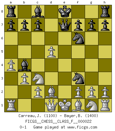 Last move : 0-1 2006 December 27 17:4:5 [Event "FICGS__CHESS__CLASS_F__000022"] [Site "FICGS"] [Date "2006.12.22"] [Round "1"] [White "Carreau,Jean-Francois"] [Black "Bayer,Bernhard"] [Result "0-1"] [WhiteElo "1100"] [BlackElo "1400"] 1.d4 Nf6 2.Nc3 d5 3.a4 Nc6 4.b3 e5 5.dxe5 Bb4 6.Bd2 Nxe5 7.e4 Qe7 8.exd5 Nf3+ 0-1 Queen's pawn game Player Black won this chess game. Follow this game move after move (download)It was clear to me that the vulnerable point of the American Grandmaster (Bobby Fischer) was in double-edged, hanging, irrational positions, where he often failed to find a win even in a won position. (Efim Geller) Es ist wirklich schade, dass so viele Schachspieler nicht auf ihr Äußeres achten! (Alexandra Kosteniuk) El Ajedrez es un regaderazo frío para la mente. (Sir John Simon) Les échecs c'est le défi de l'alpiniste, toujours plus haut, prêt à tout pour monter à l'assaut du Roi ennemi. Les échecs, c'est de la musique en mouvement, un ballet majestueux pour les yeux. C'est de la poésie composée par les fantômes du passé qui au même titre que Rimbaud ou Verlaine méritent notre admiration. Les échecs, c'est de la peinture ou le moindre mouvement modifie le tableau pour en faire un Picasso ou un Van Gogh. Les échecs, c'est tout et rien, c'est la vie et la mort. Jjulie33 sur le forum de France-Echecs. If we knew what we were doing, we would not call it research. (Albert Einstein)