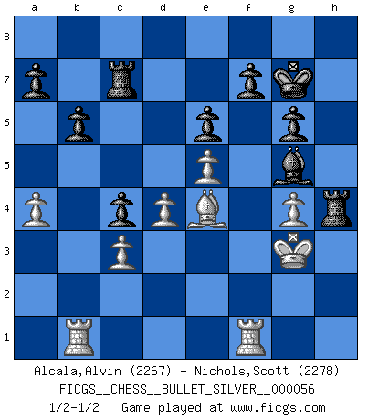 Last move : 1/2-1/2 2011 May 14 20:17:51 [Event "FICGS__CHESS__BULLET_SILVER__000056"] [Site "FICGS"] [Date "2011.05.14"] [Round "1"] [White "Alcala,Alvin"] [Black "Nichols,Scott"] [Result "1/2-1/2"] [WhiteElo "2267"] [BlackElo "2278"] 1.e4 e6 2.d4 d5 3.e5 c5 4.c3 Bd7 5.Nf3 Nc6 6.Be2 Rc8 7.O-O Qc7 8.a3 c4 9.Be3 Nge7 10.Nh4 h6 11.f4 Qb6 12.Ra2 g6 13.a4 Na5 14.Nd2 Bg7 15.Qc2 O-O 16.Rb1 Qc7 17.Bf2 Nac6 18.b4 cxb3 19.Qxb3 Na5 20.Qb4 Rfe8 21.Rc1 h5 22.Bb5 Bc6 23.Be3 Bf8 24.Qb2 Qd7 25.Bf2 Rc7 26.h3 Nc8 27.Nhf3 Bh6 28.Qb4 b6 29.Be3 Ne7 30.Nh4 Nc4 31.Nxc4 dxc4 32.Qb2 Nd5 33.Bd2 Nxf4 34.Bxf4 Bxf4 35.Rf1 Be3+ 36.Kh2 Rd8 37.Qe2 Bh6 38.g4 Qe7 39.Bxc6 Qxh4 40.Bg2 hxg4 41.Qxg4 Qxg4 42.hxg4 Kg7 43.Kg3 Bg5 44.Be4 Rh8 45.Rb2 Bd8 46.Kg2 Rh7 47.R2b1 Rh4 48.Kg3 Bg5 1/2-1/2 French : Advance variation Kingside Castling by player White (move 7) Kingside Castling by player Black (move 15) This chess game ended in a draw. Follow this game move after move (download)I like to say that Bobby Fischer was the greatest player ever. But what made Fischer a genius was his ability to blend an American freshness and pragmatism with Russian ideas about strategy. (Bruce Pandolfini) Vom Schach wurde gesagt das Leben sei dafür nicht lange genug. Aber das ist der Fehler des Lebens, nicht des Schach'. (Irving Chernev) Alekhine es un poeta que crea un trabajo de arte de algo que raramente inspiraría a otra persona a mandar una tarjeta postal. (Max Euwe) Le moment que je préfère le plus dans une rencontre, c'est celui où je sens que la personnalité de l'adversaire se brise. (Robert Fischer) Be who you are, and say what you feel because those who mind don't matter, and those who matter don't mind. (Dr Seuss)