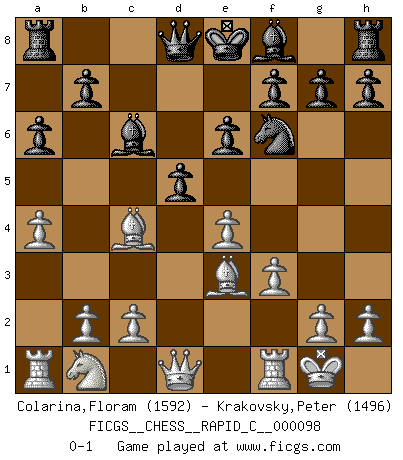 Last move : 0-1 2011 June 28 8:3:59 [Event "FICGS__CHESS__RAPID_C__000098"] [Site "FICGS"] [Date "2011.05.16"] [Round "1"] [White "Colarina,Floram"] [Black "Krakovsky,Peter"] [Result "0-1"] [WhiteElo "1592"] [BlackElo "1496"] 1.e4 c5 2.Nf3 d6 3.d4 cxd4 4.Nxd4 Nf6 5.f3 a6 6.Bc4 Bd7 7.O-O Nc6 8.Nxc6 Bxc6 9.Be3 e6 10.a4 d5 0-1 This chess game has been lost on time (started : 2011.05.16 0:1:36) Sicilian : Prins (Moscow) variation Kingside Castling by player White (move 7) Player Black won this chess game. Follow this game move after move (download)I still hope to kill Fischer. (Boris Spassky) Irgendwie scheint mir sonntags früh um 9 Uhr der Killerinstinkt verloren gegangen zu sein. (Alexej Shirov) Los Peones son nacidos libres, y aún así, se encuentran por doquier encadenados. (Rick Kennedy) Si rien de grave n'est détecté lors de l'analyse d'une position, on joue alors le coup. Seconde règle de Blumenfeld. Somewhere in the world there is an epigram for every dilemma. (Hendrik Willem van Loon)