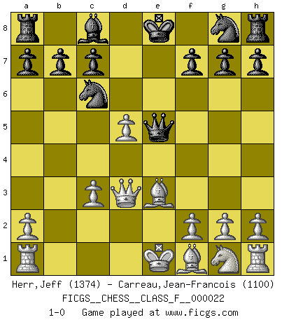 Last move : 1-0 2007 February 20 23:13:43 [Event "FICGS__CHESS__CLASS_F__000022"] [Site "FICGS"] [Date "2006.12.22"] [Round "1"] [White "Herr,Jeff"] [Black "Carreau,Jean-Francois"] [Result "1-0"] [WhiteElo "1374"] [BlackElo "1100"] 1.d4 Nc6 2.c4 e6 3.e4 d5 4.exd5 exd5 5.cxd5 Qxd5 6.Be3 Bb4+ 7.Nc3 Qe6 8.d5 Bxc3+ 9.bxc3 Qe5 10.Qd3 1-0 This chess game has been lost on time (started : 2006.12.22 19:9:25) Queen's pawn : Lundin (Kevitz-Mikenas) defense Player White won this chess game. Follow this game move after move (download)When I have White, I win because I am white; When I have Black, I win because I am Bogolyubov. (Bogolyubov) Nur ein wirklich starker Spieler weiß wie schwach er spielt. (Savielly Grigorievitsch Tartakower) Cuando estes solo, cuando te sientas un extraño en el mundo, juega al Ajedrez. Esto levantará tu espiritu y será tu consejero de guerra. (Aristóteles) C'est la seule position que je connaisse où les deux camps sont mals. Propos prêtés à V. Anand. All the biggest technological inventions created by man - the airplane, the automobile, the computer - says little about his intelligence, but speaks volumes about his laziness. (Mark Kennedy)
