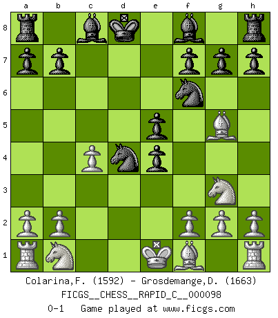 Last move : 0-1 2011 July 3 8:11:51 [Event "FICGS__CHESS__RAPID_C__000098"] [Site "FICGS"] [Date "2011.05.16"] [Round "1"] [White "Colarina,Floram"] [Black "Grosdemange,David"] [Result "0-1"] [WhiteElo "1592"] [BlackElo "1663"] 1.d4 Nf6 2.c4 c5 3.Nf3 cxd4 4.Nxd4 e5 5.Nf5 d5 6.Ng3 Nc6 7.e4 dxe4 8.Qxd8+ Kxd8 9.Bg5 Nd4 0-1 This chess game has been lost on time (started : 2011.05.16 0:1:36) Benoni defense Player Black won this chess game. Follow this game move after move (download)Examine moves that smite! A good eye for smites is far more important than a knowledge of strategical principles. (Purdy) Schach ist ein Teil der Kultur, und wenn es mit der Kultur abwärts geht, geht es auch mit dem Schach abwärts. (Mikhail Moiseyevich Botvinik) Las combinaciones han sido siempre el aspecto más intrigante del Ajedrez. Los Maestros las buscan, el público las aplauden, los críticos las alaban. La razón se debe a que las combinaciones hacen posible que el Ajedrez sea más que un ejercicio matemático con una carencia de vida. Ellas son la poesía del juego, son del Ajedrez lo que la melodía es de la música. Ellas representan el triunfo de la mente sobre la materia. (Reuben Fine) A chaque perte on perd un peu de soi. (Joël Lautier) A computer lets you make more mistakes faster than any invention in human history - with the possible exceptions of handguns and tequila. (Mitch Ratcliffe)