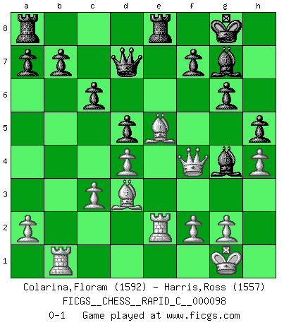 Last move : 0-1 2011 July 5 20:12:18 [Event "FICGS__CHESS__RAPID_C__000098"] [Site "FICGS"] [Date "2011.05.16"] [Round "1"] [White "Colarina,Floram"] [Black "Harris,Ross"] [Result "0-1"] [WhiteElo "1592"] [BlackElo "1557"] 1.c4 Nf6 2.d4 e6 3.Nc3 d5 4.Nf3 Be7 5.Bf4 c6 6.cxd5 exd5 7.e4 Nxe4 8.Bd3 Nxc3 9.bxc3 Nd7 10.O-O O-O 11.Re1 Re8 12.Ne5 Nxe5 13.Bxe5 Be6 14.Qh5 g6 15.Qh6 Bf8 16.Qf4 Bg7 17.h4 h5 18.Rab1 Qd7 19.Re2 Bg4 0-1 This chess game has been lost on time (started : 2011.05.16 0:1:36) English, 1...Nf6 (Anglo-Indian defense) Kingside Castling by player White (move 10) Kingside Castling by player Black (move 10) Player Black won this chess game. Follow this game move after move (download)The defensive power of a pinned piece is only imaginary. (Aaron Nimzovich) Ich bewundere Kasparows phantasievolle Angriffssiege aus den Achtzigern und Neunzigern, aber wenn man sie mit dem Computer überprüft, nimmt der Computer in jeder zweiten Partie die Opfer an, verteidigt sich und gewinnt. (Vladimir Kramnik) El Rey es una pieza de pelea. ¡Usenlo!. (Wilhelm Steinitz) Je ne suis pas le dernier à jouer lâchement des coups douteux pendant le zeïtnot de l'adversaire pour l'achever: en effet les coups qui font le plus peur sont ceux que l'on ne comprend pas. Je me fais souvent peur quand je joue. (Un professeur anonyme) Chess, like love, like music, has the power to make people happy. (Siegbert Tarrasch)