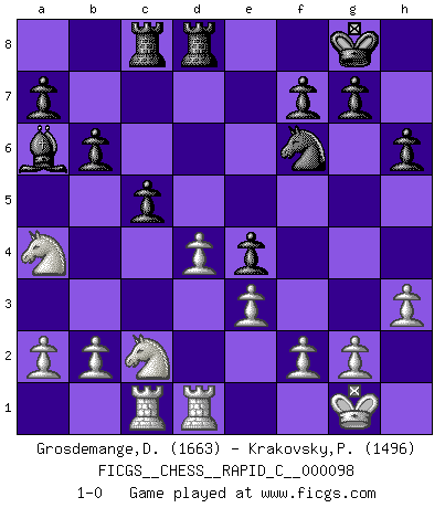 Last move : 1-0 2011 August 12 8:19:54 [Event "FICGS__CHESS__RAPID_C__000098"] [Site "FICGS"] [Date "2011.05.16"] [Round "1"] [White "Grosdemange,David"] [Black "Krakovsky,Peter"] [Result "1-0"] [WhiteElo "1663"] [BlackElo "1496"] 1.d4 d5 2.Nf3 Nf6 3.c4 c6 4.Nc3 e6 5.Bg5 Be7 6.e3 Nbd7 7.cxd5 exd5 8.Bd3 O-O 9.Qc2 h6 10.Bh4 Re8 11.O-O Ne4 12.Bxe7 Qxe7 13.Bxe4 dxe4 14.Nd2 Nf6 15.Rac1 b6 16.Qa4 Bd7 17.Qa6 Bc8 18.Qa4 Bd7 19.Qa6 Bf5 20.h3 Red8 21.Nc4 Bc8 22.Qa3 Qxa3 23.Nxa3 Ba6 24.Rfd1 Rac8 25.Na4 c5 26.Nc2 1-0 Queen's pawn game Kingside Castling by player Black (move 8) Kingside Castling by player White (move 11) Player White won this chess game. Follow this game move after move (download)I had a toothache during the first game. In the second game I had a headache. In the third game it was an attack of rheumatism. In the fourth game, I wasn't feeling well. And in the fifth game? Well, must one have to win every game ? (Siegbert Tarrasch) Über Kasparov: Es ist offensichtlich, daß er in einem totalitären Staat aufwuchs und deshalb zu diktatorischen Zügen neigt. (Viktor Kortschnoi) Hoy en día, si tu no eres un Gran Maestro a los 14 años, es mejor que lo olvides. (Anand Viswanathan) C'est une question de caractère, Beaucoup de gens perdent leur motivation très vite. D'autres, ils sont rares, peuvent la conserver très longtemps. J'aime les échecs, encore aujourd'hui je suis heureux d'analyser des parties. J'aime toujours gagner, je déteste encore perdre. Bien jouer est important pour mon intégrité intellectuelle et morale. Et puis les échecs vivent en ce moment une période historique grâce à Internet. Ils se développent dans les systèmes éducatifs à travers le monde. Ils sortent de leur ghetto, et c'est mon rôle de mener à bien cette révolution. (Gary Kasparov) The real voyage of discovery consists not in seeking new lands but in seeing with new eyes. (Marcel Proust)