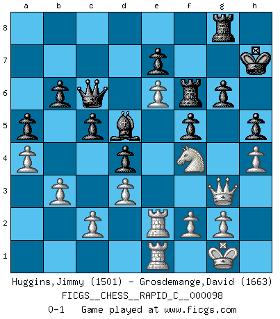Last move : 0-1 2011 October 17 0:5:59 [Event "FICGS__CHESS__RAPID_C__000098"] [Site "FICGS"] [Date "2011.05.16"] [Round "1"] [White "Huggins,Jimmy"] [Black "Grosdemange,David"] [Result "0-1"] [WhiteElo "1501"] [BlackElo "1663"] 1.e4 c5 2.Nf3 Nc6 3.Bb5 g6 4.O-O Bg7 5.Re1 Nf6 6.e5 Nd5 7.Nc3 Nc7 8.Bxc6 dxc6 9.h3 Ne6 10.d3 O-O 11.a4 a5 12.Ne4 b6 13.b3 Nd4 14.Bf4 Be6 15.Neg5 Bd5 16.Nxd4 cxd4 17.e6 f6 18.Nf7 Qc8 19.Qg4 f5 20.Qh4 Bf6 21.Ng5 h5 22.Qg3 Kg7 23.h4 c5 24.Re2 Qc6 25.Rae1 Rae8 26.Nh3 Rg8 27.Bg5 Kh7 28.Nf4 Ref8 29.Bxf6 Rxf6 0-1 This chess game has been lost on time (started : 2011.05.16 0:1:36) Sicilian : Nimzovich-Rossolimo attack (with ...g6, without ...d6) Kingside Castling by player White (move 4) Kingside Castling by player Black (move 10) Player Black won this chess game. Follow this game move after move (download)Let the perfectionist play postal. (Yasser Seirawan) Man wirke der falschen Auffassung entgegen, als ob jeder Zug Unmittelbares zu leisten habe; auch Werte- und Ruhezüge haben ihre Existenzberechtigung. (Aaron Nimzowitsch) No puedes jugar al Ajedrez si eres de corazón noble. (Proverbio Francés) On est toujours la mazette de quelqu'un d'autre. (Anonyme) The only sure thing about luck is that it will change. (Wilson Mizner)