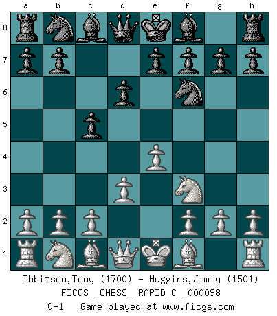 Last move : 0-1 2011 June 20 7:59:21 [Event "FICGS__CHESS__RAPID_C__000098"] [Site "FICGS"] [Date "2011.05.16"] [Round "1"] [White "Ibbitson,Tony"] [Black "Huggins,Jimmy"] [Result "0-1"] [WhiteElo "1700"] [BlackElo "1501"] 1.e4 c5 2.Nf3 d6 3.d3 Nf6 0-1 This chess game has been lost on time (started : 2011.05.16 0:1:36) Sicilian Player Black won this chess game. Follow this game move after move (download)The blunders are all there on the board, waiting to be made. (Savielly Tartakover) Matt entspricht nicht immer den Tatsachen. (Savielly Grigorievitsch Tartakower) La maestría del Ajedrez consiste esencialmente en analizar posiciónes de Ajedrez con precisión. (Mikhail Botvinnik) La tactique est l'élément le plus important du milieu de jeu. (Siegbert Tarrasch) Perhaps chess is the wrong game for the times (The Chess Master and the Computer, by Garry Kasparov - 2010)