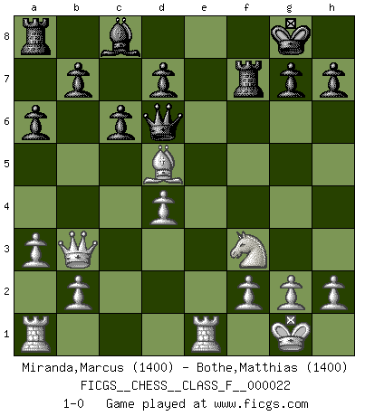 Last move : 1-0 2007 February 17 16:17:1 [Event "FICGS__CHESS__CLASS_F__000022"] [Site "FICGS"] [Date "2006.12.22"] [Round "1"] [White "Miranda,Marcus"] [Black "Bothe,Matthias"] [Result "1-0"] [WhiteElo "1400"] [BlackElo "1400"] 1.e4 e5 2.Nf3 Nc6 3.Bb5 Bc5 4.c3 a6 5.Ba4 Nf6 6.d4 exd4 7.cxd4 Bb4+ 8.Bd2 Nxe4 9.Bxb4 Nxb4 10.O-O O-O 11.a3 Nd5 12.Bc2 Qe7 13.Re1 f5 14.Nbd2 Qd6 15.Nxe4 fxe4 16.Bxe4 c6 17.Qb3 Rf7 18.Bxd5 1-0 Ruy Lopez : Classical defense, 4.c3 Kingside Castling by player White (move 10) Kingside Castling by player Black (move 10) Player White won this chess game. Follow this game move after move (download)If your opponent cannot do anything active, then don't rush the position; instead you should let him sit there, suffer, and beg you for a draw. (Jeremy Silman) Aljechin war kein Nazi. Er war ein Opportunist. Ein schrecklicher Mann. Er liebte Geld über alles und würde für Geld ein Jude, ein Katolik oder ein Protestant werden. (Miguel Najdorf) Si tu oponente no puede hacer nada activo, entonces no apures la posición; En vez de eso, dejalo estar sentado ahí, sufriendo y rogandote por un empate. (Jeremy Silman) La tactique, c'est ce que vous faites quand il y a quelque chose à faire; la stratégie, c'est ce que vous faites quand il n'y a rien à faire. (Savielli Tartacower) I believe in luck. How else can you explain the success of those you dislike ? (Jean Cocteau)