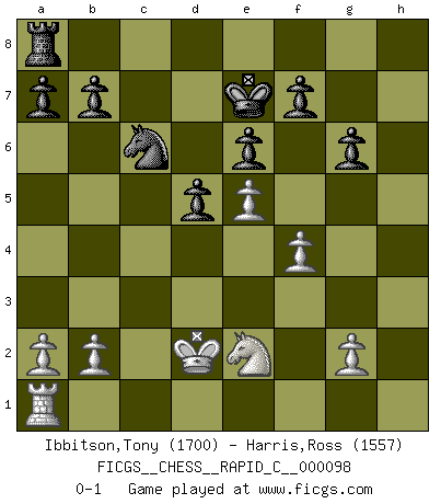 Last move : 0-1 2011 July 6 20:11:32 [Event "FICGS__CHESS__RAPID_C__000098"] [Site "FICGS"] [Date "2011.05.16"] [Round "1"] [White "Ibbitson,Tony"] [Black "Harris,Ross"] [Result "0-1"] [WhiteElo "1700"] [BlackElo "1557"] 1.e4 c6 2.d4 d5 3.e5 Bf5 4.Ne2 e6 5.Ng3 Bg6 6.h4 h5 7.Be2 c5 8.c3 Nc6 9.Bxh5 Bxh5 10.Nxh5 g6 11.Bg5 Be7 12.Bxe7 Qxe7 13.Ng3 cxd4 14.cxd4 Rxh4 15.Rxh4 Qxh4 16.Nc3 Qxd4 17.Qxd4 Nxd4 18.Kd2 Ne7 19.Nge2 Nxe2 20.Nxe2 Nc6 21.f4 Ke7 0-1 This chess game has been lost on time (started : 2011.05.16 0:1:36) Caro-Kann : Advance variation Player Black won this chess game. Follow this game move after move (download)A bad plan is better than none at all. (Frank Marshall) Was ist der Unterschied zwischen einem Strassenarbeiter und einem Schachspieler? --Der Schachspieler bewegt sich ab und zu. (Anonymous) Botvinnik trató de alejar el misterio referente al Ajedrez, siempre relacionandolo a situaciones de la vida diaria. Solía llamar al Ajedrez un problema inexacto típico, similar a aquellos en que la gente tiene siempre que resolver a cada día. (Garry Kasparov) Un journaliste : 'Vous préférez avoir une dame de plus sur l'échiquier ou au lit ?' Boris Spassky : 'Ca dépend de la position.' For peace of mind, resign as general manager of the universe. (Douglas Adams)