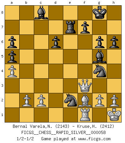 Last move : 1/2-1/2 2011 June 19 20:49:21 [Event "FICGS__CHESS__RAPID_SILVER__000058"] [Site "FICGS"] [Date "2011.05.16"] [Round "1"] [White "Bernal Varela,Nelson"] [Black "Kruse,Herbert"] [Result "1/2-1/2"] [WhiteElo "2143"] [BlackElo "2412"] 1.e4 c5 2.Nf3 d6 3.d4 cxd4 4.Nxd4 Nf6 5.Nc3 a6 6.Bg5 e6 7.f4 Qb6 8.Nb3 Be7 9.Qf3 Nbd7 10.Be2 Qc7 11.a4 h6 12.Bh4 b6 13.O-O Bb7 14.f5 exf5 15.Qxf5 O-O 16.Rad1 Ne5 17.Nd4 Rae8 18.Bg3 Qc5 19.Bf2 Qb4 20.Nb3 Nxe4 21.Rd4 Nxc3 22.Rxb4 Nxe2+ 23.Kh1 g6 24.Qh3 Bg5 25.Na5 Bc8 26.Qa3 bxa5 27.Re4 Ng4 28.Rxe8 Rxe8 29.Qf3 Re7 1/2-1/2 Sicilian : Najdorf, 7...Qb6 Kingside Castling by player White (move 13) Kingside Castling by player Black (move 15) This chess game ended in a draw. Follow this game move after move (download)All I want to do, ever, is just play Chess. (Bobby Fischer) Schach ist das schnellste Spiel der Welt, weil man in jeder Sekunde Tausende von Gedanken ordnen muß. (Albert Einstein) La caracteristica mas importante en la posición del Ajedrez es la actividad de las piezas. Esto es absolutamente fundamental en todas las fases del juego: Apertura, Juego Medio y especialmente Finales. La limitación primordial en la actividad de una pieza, es la estructuración de los Peones. (Michael Stean) Les échecs sont un jeu par leur forme, un art par leur essence et une science par sa difficulté d'acquisition. Ils peuvent vous procurer autant de plaisir qu'un bon livre ou une belle musique, mais vous n'aurez une réelle joie que si vous arrivez à bien jouer. (Tigran Petrosian) Don't be discouraged. It's often the last key in the bunch that opens the lock. (Author unknown)