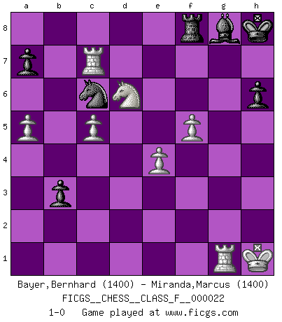 Last move : 1-0 2007 March 2 3:5:5 [Event "FICGS__CHESS__CLASS_F__000022"] [Site "FICGS"] [Date "2006.12.22"] [Round "1"] [White "Bayer,Bernhard"] [Black "Miranda,Marcus"] [Result "1-0"] [WhiteElo "1400"] [BlackElo "1400"] 1.d4 d5 2.c4 c6 3.Nf3 Nf6 4.Nc3 dxc4 5.a4 Bf5 6.e3 e6 7.Bxc4 Be7 8.O-O O-O 9.Qe2 Nbd7 10.e4 Bg4 11.Rd1 Nb6 12.Ba2 Qc7 13.h3 Bh5 14.g4 Bg6 15.Ne5 Nfd7 16.a5 Nc8 17.Nxd7 Qxd7 18.f4 h6 19.f5 exf5 20.gxf5 Bh7 21.Qg4 Kh8 22.Bf4 Qe8 23.Rd2 Rg8 24.Kh1 Bf8 25.Be5 Bd6 26.Rg1 Bxe5 27.dxe5 Ne7 28.Qf4 b5 29.b4 c5 30.bxc5 b4 31.Nd5 Rb8 32.Bb3 Nc6 33.e6 fxe6 34.Nc7 Qh5 35.Bxe6 Qxh3+ 36.Rh2 Qc3 37.Bxg8 Rxg8 38.Nb5 Qf6 39.Nd6 Rf8 40.Qg3 Ne5 41.Rb2 Nc6 42.Rbg2 b3 43.Qxg7+ Qxg7 44.Rxg7 Bg8 45.Rc7 1-0 QGD Slav : Dutch variation Kingside Castling by player White (move 8) Kingside Castling by player Black (move 8) Player White won this chess game. Follow this game move after move (download)There is no remorse like the remorse of Chess. (H. G. Wells) Das Schachspiel ist ein See, in welchem eine Mücke baden und ein Elefant ertrinken kann. (Emanuel Lasker) Fischer era un maestro de claridad y un Rey del posicionamiento astuto. Sus oponentes podían ver hacia donde se dirigía pero eran impotentes para detenerlo. (Bruce Pandolfini) Les échecs sont un jeu par leur forme, un art par leur essence et une science par sa difficulté d'acquisition. Ils peuvent vous procurer autant de plaisir qu'un bon livre ou une belle musique, mais vous n'aurez une réelle joie que si vous arrivez à bien jouer. (Tigran Petrosian) You know what they say : You lie down with the Devil, you wake up in Hell. (Horatio Caine, C.S.I. Miami)