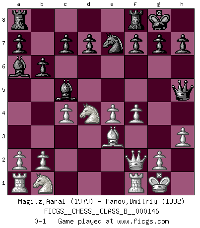 Last move : 0-1 2011 October 7 23:41:9 [Event "FICGS__CHESS__CLASS_B__000146"] [Site "FICGS"] [Date "2011.05.16"] [Round "1"] [White "Magitz,Aaral"] [Black "Panov,Dmitriy"] [Result "0-1"] [WhiteElo "1979"] [BlackElo "1992"] 1.e4 e5 2.Nf3 Nc6 3.d4 exd4 4.Nxd4 Bc5 5.Be3 Qf6 6.c3 Nge7 7.Bc4 Ne5 8.Be2 O-O 9.f4 Qh6 10.Qd2 Ng4 11.Bxg4 Qh4+ 12.Qf2 Qxg4 13.O-O b6 14.h3 Qh5 15.c4 Ba6 0-1 Scotch game Kingside Castling by player Black (move 8) Kingside Castling by player White (move 13) Player Black won this chess game. Follow this game move after move (download)The hallmark of the artist is simplicity. (Larry Evans) Bis zum Jahr 1971 verlief in meiner Schachkariere alles glatt. Dieses dramatische Match [Fischer-Taimanov 6:0] machte mein Leben zur Hölle. (Mark Taimanov) No hay otro maestro que tenga una voluntad terrífica de ganar. Al tablero, el irradía peligro y aún los oponentes mas fuertes tienden a congelarse como liebres cuando olfatean a una pantera. Aún sus debilidades son peligrosas. Con las blancas, su juego de apertura es predecible - te es posible hacer planes en su contra - pero es tan fuerte que tus planes casi nunca funcionan. En el juego medio, su precisión e invención son fabulosas y en finales, tú simplemente no le puedes vencer. (Experto Alemán anónimo) On croit qu'il y a plus de mauvais joueurs que de bons joueurs, c'est faux : Il y a autant de joueurs qui gagnent que de joueurs qui perdent. (Philippe Geluck) Better than a thousand days of diligent study is one day with a great teacher. (Japanese proverb)
