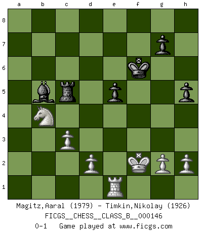 Last move : 0-1 2011 October 7 11:37:40 [Event "FICGS__CHESS__CLASS_B__000146"] [Site "FICGS"] [Date "2011.05.16"] [Round "1"] [White "Magitz,Aaral"] [Black "Timkin,Nikolay"] [Result "0-1"] [WhiteElo "1979"] [BlackElo "1926"] 1.e4 e5 2.Nf3 Nc6 3.Bb5 a6 4.Bxc6 dxc6 5.O-O Qd6 6.Na3 b5 7.c3 c5 8.Nc2 Bb7 9.a4 c4 10.Ne3 Nf6 11.axb5 axb5 12.Rxa8+ Bxa8 13.b3 Bxe4 14.bxc4 Bd3 15.Re1 Nd7 16.cxb5 f6 17.Nd4 Kf7 18.Nc6 h5 19.Qb3+ Kg6 20.Nd8 Qe7 21.Qd5 Nc5 22.Ba3 Qd7 23.Qxd7 Nxd7 24.Bxf8 Rxf8 25.Ne6 Rc8 26.Nd5 Kf7 27.Nexc7 Nb6 28.f4 Nxd5 29.Nxd5 Rc5 30.Nb4 Bxb5 31.fxe5 fxe5 32.Kf2 Kf6 0-1 Ruy Lopez : Exchange, Bronstein variation Kingside Castling by player White (move 5) Player Black won this chess game. Follow this game move after move (download)No other master has such a terrific will to win. At the board he radiates danger, and even the strongest opponents tend to freeze, like rabbits when they smell a panther. Even his weaknesses are dangerous. As white, his opening game is predictable - you can make plans against it - but so strong that your plans almost never work. In the middle game his precision and invention are fabulous, and in the end game you simply cannot beat him. (Anonymous German Expert) Nicht daß Diemer aus Opportunismus Mitglied der NSDAP geworden wäre. Er war ein Fanatiker, in allem, was er tat. (Hans Ree) El Ajedrez es un invernadero donde los frutos del carácter pueden madurar mas completamente que en la vida. (Edward Morgan Foster) Même si vous avez un bon coup à faire, regardez toujours s'il n'y en a pas un qui lui soit préférable. (Pedro Damiano) All the troubles of the world come from being unable to sit alone in a quiet room. (Blaise Pascal)