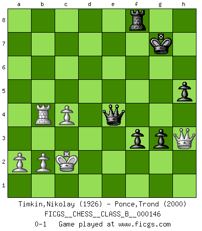 Last move : 0-1 2011 October 25 10:47:43 [Event "FICGS__CHESS__CLASS_B__000146"] [Site "FICGS"] [Date "2011.05.16"] [Round "1"] [White "Timkin,Nikolay"] [Black "Ponce,Trond"] [Result "0-1"] [WhiteElo "1926"] [BlackElo "2000"] 1.e4 c6 2.d4 d5 3.Nc3 dxe4 4.Nxe4 Nf6 5.Nxf6+ exf6 6.c3 Bd6 7.Bd3 O-O 8.Ne2 c5 9.Qc2 cxd4 10.Nxd4 g6 11.Be3 Nc6 12.Nxc6 bxc6 13.O-O-O Qc7 14.h4 Bg4 15.Be2 Be6 16.Qa4 Bd5 17.h5 Bxg2 18.Rhg1 Bd5 19.hxg6 fxg6 20.Bc4 Bxc4 21.Qxc4+ Kh8 22.Qh4 g5 23.Qh3 Rae8 24.Rd3 Rf7 25.Rgd1 Bf4 26.Rd7 Bxe3+ 27.fxe3 Qc8 28.Qf5 Ref8 29.Qe6 Kg8 30.e4 Qe8 31.Qxc6 Rxd7 32.Qxd7 Qxe4 33.Qxa7 h5 34.Qd7 g4 35.Rd4 Qe1+ 36.Kc2 Qe2+ 37.Kc1 g3 38.Qf5 Qe3+ 39.Kc2 Qg5 40.Qe4 Kg7 41.Qg2 Qg6+ 42.Kb3 f5 43.Rf4 Qg5 44.Rb4 f4 45.c4 f3 46.Qh3 Qe3+ 47.Kc2 Qe4+ 0-1 Caro-Kann : Tartakower (Nimzovich) variation Kingside Castling by player Black (move 7) Queenside Castling by player White (move 13) Player Black won this chess game. Follow this game move after move (download)It is difficult to play against Einstein's theory --on his first loss to Fischer. (Mikhail Tal) Ich verstehe den Grund nicht, warum die Aufteilung in Frauen und Männer überhaupt im Schach besteht. (Judith Polgar) Cuando no sepas que mover, espera por una idea que se le venga a la la cabeza de tu oponente. Tenlo por seguro de que esa idea estará incorrecta. (Siegbert Tarrasch) Les sacrifices démontrent seulement que quelqu'un a gaffé. (Savielly Tartacover) Lamb in skin of tiger, still fears the wolf. (Chinese proverb)