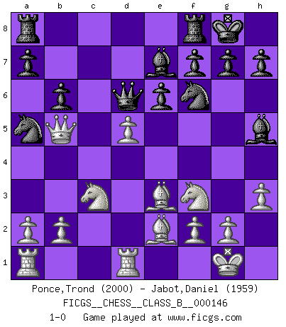 Last move : 1-0 2011 October 1 23:18:46 [Event "FICGS__CHESS__CLASS_B__000146"] [Site "FICGS"] [Date "2011.05.16"] [Round "1"] [White "Ponce,Trond"] [Black "Jabot,Daniel"] [Result "1-0"] [WhiteElo "2000"] [BlackElo "1959"] 1.e4 c5 2.c3 d5 3.exd5 Qxd5 4.d4 Nf6 5.Nf3 Bg4 6.Be2 e6 7.h3 Bh5 8.O-O Nc6 9.Be3 cxd4 10.cxd4 Be7 11.Nc3 Qd6 12.Qb3 O-O 13.Rfd1 Na5 14.Qb5 b6 15.d5 1-0 This chess game has been lost on time (started : 2011.05.16 21:54:4) Sicilian : Alapin's variation (2.c3) Kingside Castling by player White (move 8) Kingside Castling by player Black (move 12) Player White won this chess game. Follow this game move after move (download)Of Chess it has been said that life is not long enough for it, but that is the fault of life, not Chess. (William Ewart Napier) Mit Schach schule ich mein Gefühl für Geometrie, was für Tennis und Schach gleichermaßen wichtig ist. (Boris Becker) En posiciones complicadas, Bobby Fischer pocas veces tuvo que temer de cualquiera. (Paul Keres) Vous savez, camarade Pachman, je n'éprouve pas de plaisir à être ministre, je jouerais plutôt aux échecs comme vous, ou alors ferais une révolution au Venezuela. (Che Guevara à Ludek Pachman, 'Checkmate in Prague', 1975) May the force be with you. (Han Solo in Star Wars ep.4)