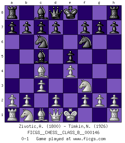 Last move : 0-1 2011 June 27 20:4:34 [Event "FICGS__CHESS__CLASS_B__000146"] [Site "FICGS"] [Date "2011.05.16"] [Round "1"] [White "Zivotic,Aleksandar"] [Black "Timkin,Nikolay"] [Result "0-1"] [WhiteElo "1800"] [BlackElo "1926"] 1.e4 e5 2.Nf3 Nc6 3.Bc4 Bc5 4.c3 Nf6 0-1 This chess game has been lost on time (started : 2011.05.16 21:54:4) Giuoco Piano Player Black won this chess game. Follow this game move after move (download)There's never before been a Chess player with such a thorough knowledge of the intricacies of the game and such an absolutely indomitable will to win. I think Bobby is the greatest player that ever lived. (Lisa Lane) Obendrein hat der FIDE-Präsident den Revolutionsführer Gaddafi zum »Großmeister« ernannt, am Ende der WM. Das ist lächerlich! (Joel Lautier) Dios mío, Bobby Fischer juega tan simple. (Alexei Suetin) Il n'y a plus de joueurs du niveau de Jacob Murray dont la seule quête est le beau jeu, le plaisir de voir les pièces construire quelque chose. Sur 10 idées à la minute, 9 seront sans intérêt, la dernière s'avèrera géniale. (Christian Bauer) He who defends everything defends nothing. (Frederick the Great)