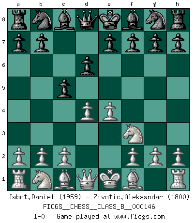 Last move : 1-0 2011 June 27 20:4:34 [Event "FICGS__CHESS__CLASS_B__000146"] [Site "FICGS"] [Date "2011.05.16"] [Round "1"] [White "Jabot,Daniel"] [Black "Zivotic,Aleksandar"] [Result "1-0"] [WhiteElo "1959"] [BlackElo "1800"] 1.e4 c5 2.Nf3 d6 3.d4 1-0 This chess game has been lost on time (started : 2011.05.16 21:54:4) Sicilian Player White won this chess game. Follow this game move after move (download)Robert Fischer is a law unto himself. (Larry Evans) Stil? Ich habe keinen Stil! (Anatoly Karpov) El Ajedrez es parte de una cultura y si una cultura esta en decadencia, entonces también el Ajedrez declinará. (Mikhail Botvinnik) Karpov est une pièce de musée. (Garry Kasparov) Everything in life is luck. (Donald Trump)