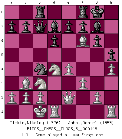 Last move : 1-0 2011 September 29 23:11:57 [Event "FICGS__CHESS__CLASS_B__000146"] [Site "FICGS"] [Date "2011.05.16"] [Round "1"] [White "Timkin,Nikolay"] [Black "Jabot,Daniel"] [Result "1-0"] [WhiteElo "1926"] [BlackElo "1959"] 1.e4 c5 2.Nf3 d6 3.d4 cxd4 4.Nxd4 Nf6 5.Nc3 g6 6.Be3 Bg7 7.f3 O-O 8.Qd2 Bd7 9.Bc4 Nc6 10.h4 Rc8 11.Bb3 h5 12.O-O-O Ne5 13.Bg5 Nc4 14.Qe2 Qc7 15.Bxf6 1-0 This chess game has been lost on time (started : 2011.05.16 21:54:4) Sicilian : Dragon, Yugoslav attack, 7...O-O Kingside Castling by player Black (move 7) Queenside Castling by player White (move 12) Player White won this chess game. Follow this game move after move (download)Who is your opponent tonight, tonight I am playing against the Black pieces. (Akiba Rubinstein) Fallen sollten polizeilich verboten werden. (Savielly Grigorievitsch Tartakower) Las Aperturas te enseñan aperturas. ¡Los Finales te enseñan Ajedrez!. (Stephan Gerzadowicz) La vie est comme un jeu d'échecs : nous esquissons un plan, mais celui-ci est tributaire de ce que daignent faire l'adversaire aux échecs et le destin dans la vie. (Arthur Schopenhauer) Perhaps chess is the wrong game for the times (The Chess Master and the Computer, by Garry Kasparov - 2010)