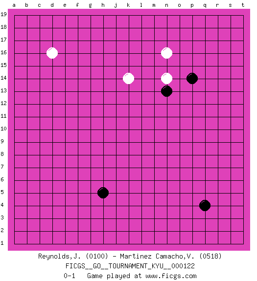 Last move : 0-1 2011 June 22 20:1:34 [Event "FICGS__GO__TOURNAMENT_KYU__000122"] [Site "FICGS"] [Date "2011.05.17"] [Round "1"] [Black "Reynolds,James"] [White "Martinez Camacho,Victor Hugo"] [Result "0-1"] [Rating 1 "0100"] [Rating 2 "0518"] 1.q4 d16 2.p14 k14 3.h5 n16 4.n13 n14 0-1 This go game has been lost on time (started : 2011.05.17 22:12:22) Here are the names of the openings (joseki) played in the four corners : Corner q16 : p14 n16 This joseki is unknown. A weak or weird move has probably been played in this corner. Player White won this Go (weiqi, baduk) game. Follow this game move after move (download)Keshi is worth as much as an invasion ! (Anonymous) It's not the size of the dog in the fight, it's the size of the fight in the dog. (Mark Twain)