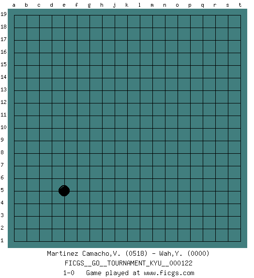 Last move : 1-0 2011 June 18 7:51:58 [Event "FICGS__GO__TOURNAMENT_KYU__000122"] [Site "FICGS"] [Date "2011.05.17"] [Round "1"] [Black "Martinez Camacho,Victor Hugo"] [White "Wah,Yung"] [Result "1-0"] [Rating 1 "0518"] [Rating 2 "0000"] 1.e5 1-0 This go game has been lost on time (started : 2011.05.17 22:12:22) Here are the names of the openings (joseki) played in the four corners : Corner d4 : e5 1-0 Go-no-go (Wu~wu~) 5-5 Point. The 5-5 was experimented with briefly during the "New Fuseki" movement in Japan in the 1930s. The 5-5 point has not retained popularity because the 4-4 hoshi (star) point strikes a better balance between influence and territory. As one can see from the variations, though, the 5-5 is playable. Player Black won this Go (weiqi, baduk) game. Follow this game move after move (download)Win the stones, lose the game. (Anonymous) Vladimir Ras-Putin is still alive... He is also a good actor, I saw him in the Lord of the Rings. (Rodolfo d'Ettorre)