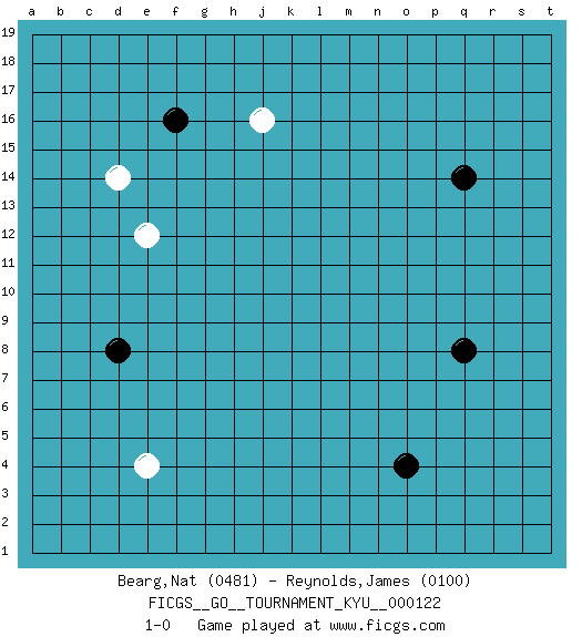 Last move : 1-0 2011 June 23 8:0:58 [Event "FICGS__GO__TOURNAMENT_KYU__000122"] [Site "FICGS"] [Date "2011.05.17"] [Round "1"] [Black "Bearg,Nat"] [White "Reynolds,James"] [Result "1-0"] [Rating 1 "0481"] [Rating 2 "0100"] 1.o4 d14 2.q14 e4 3.f16 j16 4.d8 e12 5.q8 1-0 This go game has been lost on time (started : 2011.05.17 22:12:22) Here are the names of the openings (joseki) played in the four corners : Corner d16 : d14 f16 Ootakamoku (Chaogao) 6-4 Point. The large takamoku (high) point (6-4), experimented with during the "new fuseki" movement in Japan in the 1930's. This point is seldom played as the initial corner point nowadays. Corner d4 : e4 d8 Takamoku (Gomok, Gaomu`) 5-4 Point. The takamoku (high) point (5-4). With its emphasis on influence, the 5-4 point complements the 4-4 (hoshi) point in creating an influence-oriented fuseki. Player Black won this Go (weiqi, baduk) game. Follow this game move after move (download)The enemy's vital point is your own. (Anonymous) Gambling is the son of avarice and the father of despair. (French proverb)