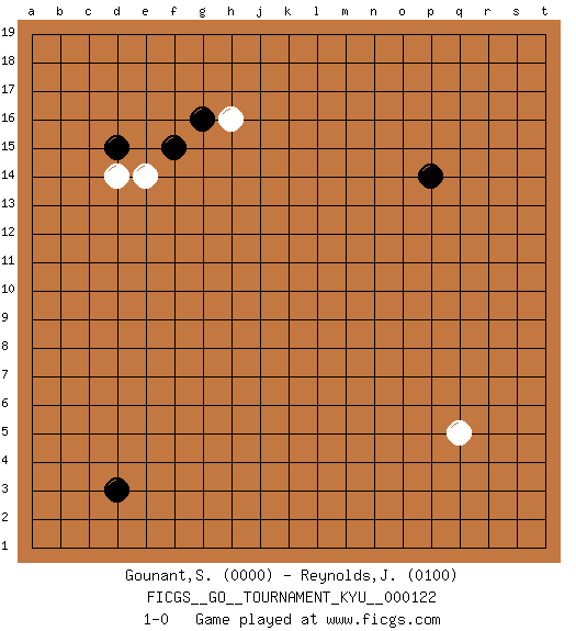 Last move : 1-0 2011 June 22 8:0:57 [Event "FICGS__GO__TOURNAMENT_KYU__000122"] [Site "FICGS"] [Date "2011.05.17"] [Round "1"] [Black "Gounant,Stanislas"] [White "Reynolds,James"] [Result "1-0"] [Rating 1 "0000"] [Rating 2 "0100"] 1.d3 q5 2.p14 d14 3.f15 h16 4.d15 e14 5.g16 1-0 This go game has been lost on time (started : 2011.05.17 22:12:22) Here are the names of the openings (joseki) played in the four corners : Corner d16 : d14 f15 Ootakamoku (Chaogao) 6-4 Point. The large takamoku (high) point (6-4), experimented with during the "new fuseki" movement in Japan in the 1930's. This point is seldom played as the initial corner point nowadays. Corner d4 : d3 1-0 Komoku (Somok, Xiao~mu`) 3-4 Point. The komoku (3-4) point is the traditional corner enclosure move.. Player Black won this Go (weiqi, baduk) game. Follow this game move after move (download)Keep inessential ataris till the end. (Anonymous) Always remember that you are unique; just like everyone else. (Unknown)