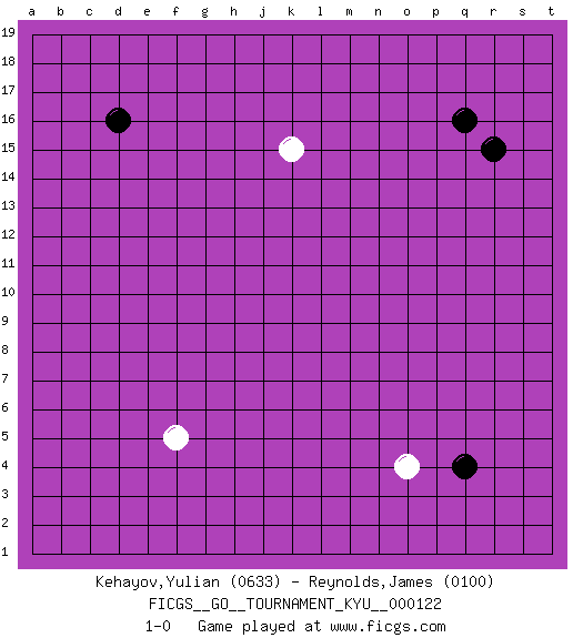 Last move : 1-0 2011 June 22 20:1:34 [Event "FICGS__GO__TOURNAMENT_KYU__000122"] [Site "FICGS"] [Date "2011.05.17"] [Round "1"] [Black "Kehayov,Yulian"] [White "Reynolds,James"] [Result "1-0"] [Rating 1 "0633"] [Rating 2 "0100"] 1.r15 o4 2.q4 f5 3.q16 k15 4.d16 1-0 This go game has been lost on time (started : 2011.05.17 22:12:22) Here are the names of the openings (joseki) played in the four corners : Corner q4 : o4 q4 Ootakamoku (Chaogao) 6-4 Point. The large takamoku (high) point (6-4), experimented with during the "new fuseki" movement in Japan in the 1930's. This point is seldom played as the initial corner point nowadays. Player Black won this Go (weiqi, baduk) game. Follow this game move after move (download)Those who are good at winning, don't usually fight. (Zhang) If we don't succeed, we run the risk of failure. (George W. Bush)