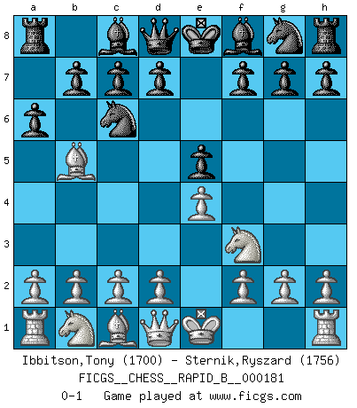 Last move : 0-1 2011 June 21 20:1:46 [Event "FICGS__CHESS__RAPID_B__000181"] [Site "FICGS"] [Date "2011.05.18"] [Round "1"] [White "Ibbitson,Tony"] [Black "Sternik,Ryszard"] [Result "0-1"] [WhiteElo "1700"] [BlackElo "1756"] 1.e4 e5 2.Nf3 Nc6 3.Bb5 a6 0-1 This chess game has been lost on time (started : 2011.05.18 12:44:32) Ruy Lopez (Spanish Opening) Player Black won this chess game. Follow this game move after move (download)If one piece is badly posted, the whole game is bad. (Tarrasch) Frage: Gibt es etwas was Sie mehr lieben als Autobahnen ohne Tempobegrenzungen? - Antwort: Deutsche Frauen ohne Tempobegrenzungen. (Loek van Wely) Aunque la mayoría de la gente disfruta observar las partidas de los grandes Maestros de ataque, algunos de los jugadores mas notables en la historia han sido los jugadores silenciosos posicionales. Lentamente ellos te aplastan despojandote de tu espacio, congestionando tus piezas y dejandote virtualmente sin nada que hacer. (Yasser Seirawan) Vouloir jouer aux échecs contre soi-même est aussi paradoxal que vouloir marcher sur son ombre. (Stefan Zweig) May I never be complete. May I never be content. May I never be perfect. Deliver me, Tyler, from being perfect and complete. (Chuck Palahniuk, Fight Club)