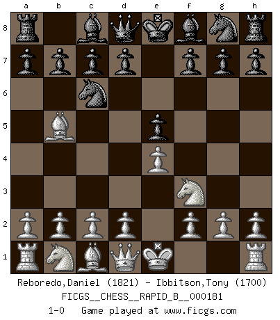 Last move : 1-0 2011 June 21 20:1:46 [Event "FICGS__CHESS__RAPID_B__000181"] [Site "FICGS"] [Date "2011.05.18"] [Round "1"] [White "Reboredo,Daniel"] [Black "Ibbitson,Tony"] [Result "1-0"] [WhiteElo "1821"] [BlackElo "1700"] 1.e4 e5 2.Nf3 Nc6 3.Bb5 1-0 This chess game has been lost on time (started : 2011.05.18 12:44:32) Ruy Lopez (Spanish Opening) Player White won this chess game. Follow this game move after move (download)Fischer was a master of clarity and a king of artful positioning. His opponents would see where he was going but were powerless to stop him. (Bruce Pandolfini) Wenn ein Kopf und ein Buch zusammenstoßen und es klingt hohl, ist es denn allemal im Buche? (Georg Christoph Lichtenberg) El Ajedrez es el arte del análisis. (Mikhail Botvinnik) Vous savez, camarade Pachman, je n'éprouve pas de plaisir à être ministre, je jouerais plutôt aux échecs comme vous, ou alors ferais une révolution au Venezuela. (Che Guevara à Ludek Pachman, 'Checkmate in Prague', 1975) God, you are such an idiot. - Actually, I thought I was more of a jerk. (Gregory House to Stacy Warner, House M.D.)