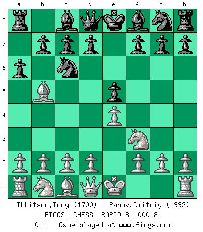 Last move : 0-1 2011 June 22 8:0:57 [Event "FICGS__CHESS__RAPID_B__000181"] [Site "FICGS"] [Date "2011.05.18"] [Round "1"] [White "Ibbitson,Tony"] [Black "Panov,Dmitriy"] [Result "0-1"] [WhiteElo "1700"] [BlackElo "1992"] 1.e4 e5 2.Nf3 Nc6 3.Bb5 a6 0-1 This chess game has been lost on time (started : 2011.05.18 12:44:32) Ruy Lopez (Spanish Opening) Player Black won this chess game. Follow this game move after move (download)Chess is 99 percent tactics. (Teichmann) Ich verlor meine Bürgerrechte, mein Gehalt wurde mir nicht mehr bezahlt und ich wurde zensiert und durfte nicht mehr ins Ausland reisen. [nach dem Match Fischer-Taimanov 6:0] (Mark Taimanov) Evita las multitudes. Haz independientemente tu propio razonamiento. Trata de ser el jugador de Ajedrez, no la pieza de Ajedrez. (Ralph Charell) Avec des compensations pour le matériel en plus... (Anonyme) Kids, you tried your best and you failed miserably. The lesson is, never try. (Simpsons)