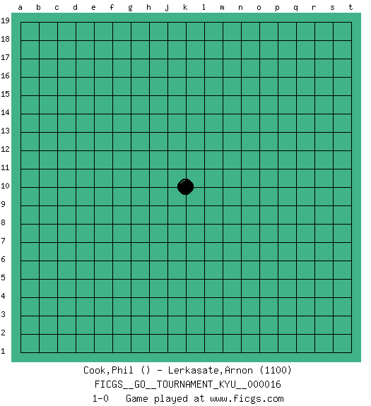 Last move : 1-0 2007 January 25 7:4:32 [Event "FICGS__GO__TOURNAMENT_KYU__000016"] [Site "FICGS"] [Date "2006.12.23"] [Round "1"] [Black "Cook,Phil"] [White "Lerkasate,Arnon"] [Result "1-0"] [Rating 2 "1100"] 1.k10 1-0 This go game has been lost on time (started : 2006.12.23 23:29:48) Here are the names of the openings (joseki) played in the four corners : Player Black won this Go (weiqi, baduk) game. Follow this game move after move (download)Balance is not what players strike for, and if it does arise, it is in spite of them. (Pierre Audouard) Memory is a way of holding onto the things you love, the things you are, the things you never want to lose. (from the television show: The Wonder Years)
