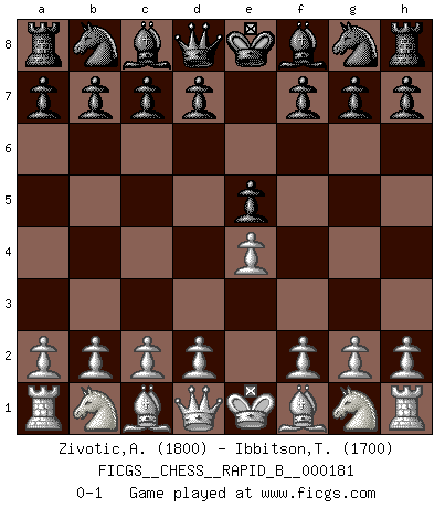 Last move : 0-1 2011 June 19 19:57:40 [Event "FICGS__CHESS__RAPID_B__000181"] [Site "FICGS"] [Date "2011.05.18"] [Round "1"] [White "Zivotic,Aleksandar"] [Black "Ibbitson,Tony"] [Result "0-1"] [WhiteElo "1800"] [BlackElo "1700"] 1.e4 e5 0-1 This chess game has been lost on time (started : 2011.05.18 12:44:32) King's pawn game Player Black won this chess game. Follow this game move after move (download)Everything is in a state of flux, and this includes the world of Chess. (Mikhail Botvinnik) Die jungen Leute sollen verstehen, dass sie noch etwas von mir lernen können und müssen. (Viktor Kortschnoi) Morphy probablemente fue el genio más grande de todos. (Bobby Fischer) Le jeu d'échecs est comme rejeté hors du temps. (Antoine de Saint-Exupéry) A mistake is only a mistake if you let it happen twice. Otherwise it is a learning experience. (Daniel Parmet)