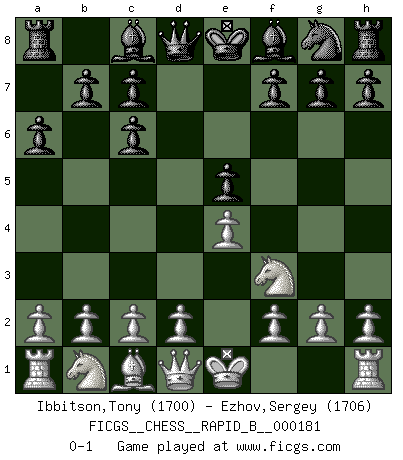 Last move : 0-1 2011 June 23 20:4:15 [Event "FICGS__CHESS__RAPID_B__000181"] [Site "FICGS"] [Date "2011.05.18"] [Round "1"] [White "Ibbitson,Tony"] [Black "Ezhov,Sergey"] [Result "0-1"] [WhiteElo "1700"] [BlackElo "1706"] 1.e4 e5 2.Nf3 Nc6 3.Bb5 a6 4.Bxc6 dxc6 0-1 This chess game has been lost on time (started : 2011.05.18 12:44:32) Ruy Lopez : Exchange variation Player Black won this chess game. Follow this game move after move (download)White lost because he failed to remember the right continuation and had to think up the moves himself. (Siegbert Tarrasch) Der beste Spieler in einem Turnier gewinnt es nie. Er landet auf Platz zwei oder drei. (Siegbert Tarrasch) Buenas posiciones no logran ganar juegos, buenas movidas sí. (Gerald Abrahams) Que feriez-vous si vous étiez en train de jouer aux échecs et que la fin du monde arrive ? Je continuerais à jouer. (Saint Borromée) To steal ideas from one person is plagiarism. To steal from many is research. (Unknown)