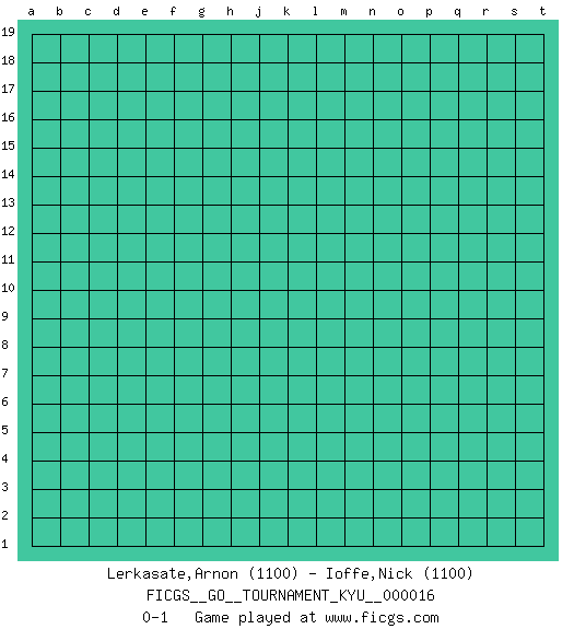 Last move : 0-1 2007 January 23 0:55:2 [Event "FICGS__GO__TOURNAMENT_KYU__000016"] [Site "FICGS"] [Date "2006.12.23"] [Round "1"] [Black "Lerkasate,Arnon"] [White "Ioffe,Nick"] [Result "0-1"] [Rating 1 "1100"] [Rating 2 "1100"] 0-1 This go game has been lost on time (started : 2006.12.23 23:29:48) Here are the names of the openings (joseki) played in the four corners : Player White won this Go (weiqi, baduk) game. Follow this game move after move (download)The game plays itself, the players don't control it. (Pierre Audouard) In theory there is no difference between theory and practice. In practice there is. (Yogi Berra)