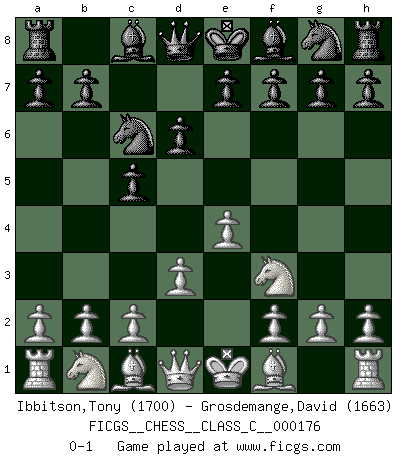 Last move : 0-1 2011 June 28 20:3:58 [Event "FICGS__CHESS__CLASS_C__000176"] [Site "FICGS"] [Date "2011.05.19"] [Round "1"] [White "Ibbitson,Tony"] [Black "Grosdemange,David"] [Result "0-1"] [WhiteElo "1700"] [BlackElo "1663"] 1.e4 c5 2.Nf3 d6 3.d3 Nc6 0-1 This chess game has been lost on time (started : 2011.05.19 15:19:32) Sicilian Player Black won this chess game. Follow this game move after move (download)By this measure (on the gap between Fischer & his contemporaries), I consider him the greatest world champion. (Garry Kasparov) Ich verstehe Aljechins Kombinationen ganz gut; aber woher er diese Angriffschancen bekommt und wie er die Eröffnung behandelt das ist für mich ein Buch mit sieben Siegeln. (Rudolf Spielmann) Cualquier cambio de material en una posición debe venir por medio de un mate, una captura o promoción de Peón. (Purdy) En blitz, le Cavalier l'emporte sur le Fou. (Vlastimil Hort) Panic is a sudden desertion of us, an a going over to the enemy of our imagination. (Christian Nevell Bovee)