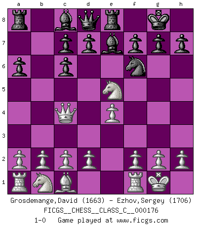 Last move : 1-0 2011 July 3 8:11:51 [Event "FICGS__CHESS__CLASS_C__000176"] [Site "FICGS"] [Date "2011.05.19"] [Round "1"] [White "Grosdemange,David"] [Black "Ezhov,Sergey"] [Result "1-0"] [WhiteElo "1663"] [BlackElo "1706"] 1.e4 e5 2.Nf3 Nc6 3.Bb5 a6 4.Ba4 Nf6 5.O-O Be7 6.Qe2 O-O 7.Bxc6 bxc6 8.Nxe5 Re8 9.Qc4 1-0 This chess game has been lost on time (started : 2011.05.19 15:19:32) Ruy Lopez : Worrall attack Kingside Castling by player White (move 5) Kingside Castling by player Black (move 6) Player White won this chess game. Follow this game move after move (download)No one ever won a game by resigning. (Unknown) Es ist nicht das erste mal, dass sich die FIDE dem Arabischen Geld gebeugt hat (über die FIDE WM 2004 in Lybien). (Larry Evans) El Ajedrez es un terrible juego. Si no controlas el centro, tu oponente tiene una posición mas holgada. Si tienes control del centro, ¡entonces realmente tu tienes algo de que preocuparte!. (Siegbert Tarrasch) Les Echecs ne sont pas pour les âmes timides. Ils requièrent un homme entier, qui ne s'arrête pas aveuglément à ce qui a été déjà établi, mais qui tente individuellement de sonder les profondeurs du jeu. (W. Steinitz) You cannot beat a roulette table unless you steal money from it. (Albert Einstein)