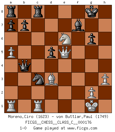 Last move : 1-0 2011 August 15 7:53:9 [Event "FICGS__CHESS__CLASS_C__000176"] [Site "FICGS"] [Date "2011.05.19"] [Round "1"] [White "Moreno,Ciro"] [Black "von Buttlar,Paul"] [Result "1-0"] [WhiteElo "1623"] [BlackElo "1749"] 1.d4 d5 2.Bf4 Nf6 3.Nf3 g6 4.c4 Bg7 5.cxd5 Nxd5 6.Be5 O-O 7.Bxg7 Kxg7 8.e4 Nf6 9.Nc3 c6 10.h3 Qa5 11.Qc2 Nbd7 12.Be2 e5 13.O-O exd4 14.Nxd4 Re8 15.f4 Qc5 16.Qd3 Qb6 17.e5 Nd5 18.Nxd5 cxd5 19.Qe3 Nc5 20.Rfd1 Be6 21.Bb5 Rec8 22.a4 Qd8 23.b4 Ne4 24.Bd3 Nc3 25.Rdc1 Qb6 26.f5 Bd7 27.e6 Be8 28.a5 Qxb4 29.exf7 Bxf7 30.Qe5+ Kg8 31.fxg6 hxg6 32.Ne6 1-0 Queen's pawn, Mason variation Kingside Castling by player Black (move 6) Kingside Castling by player White (move 13) Player White won this chess game. Follow this game move after move (download)The way he plays Chess demonstrates a man's whole nature. (Stanley Ellin) Offener Brief an US-Präsident Bush anlässlich der Verhaftung Bobby Fishers: Verhaften Sie mich. Stecken Sie mich in dieselbe Zelle wie Bobby Fisher und geben Sie uns ein Schachspiel mit. (Boris Vassilievich Spassky) En manos de Fischer's, una diminuta ventaja teórica es tan buena como tener una Reina de ventaja. (Isaac Kashdan) Votre prénom est 'Tactique', votre deuxième prénom est 'Tactique' et votre nom est 'Tactique'. (Ken Smith) Everybody lies. (Gregory House, House M.D.)