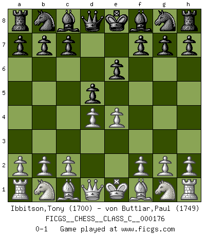 Last move : 0-1 2011 June 30 8:9:19 [Event "FICGS__CHESS__CLASS_C__000176"] [Site "FICGS"] [Date "2011.05.19"] [Round "1"] [White "Ibbitson,Tony"] [Black "von Buttlar,Paul"] [Result "0-1"] [WhiteElo "1700"] [BlackElo "1749"] 1.e4 e6 2.d4 d5 0-1 This chess game has been lost on time (started : 2011.05.19 15:19:32) French defense Player Black won this chess game. Follow this game move after move (download)Chess holds its master in its own bonds, shackling the mind and brain so that the inner freedom of the very strongest must suffer. (Albert Einstein) Der vorletzte Fehler gewinnt. (Savielly Grigorievitsch Tartakower) No hay un Gran Maestro de Ajedrez que sea normal; solo se diferencían ellos por la magnitud de su locura. (Viktor Korchnoi) Vous n'êtes pas toujours obligé de jouer le meilleur coup. Un coup doit être actif, entreprenant, correct et beau ! (David Bronstein) All war is based on deception. (Sun Tzu)