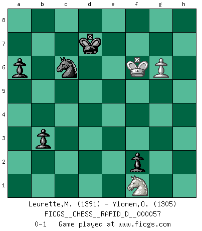 Last move : 0-1 2011 September 5 8:35:19 [Event "FICGS__CHESS__RAPID_D__000057"] [Site "FICGS"] [Date "2011.05.19"] [Round "1"] [White "Leurette,Marc-Antoine"] [Black "Ylonen,Olli"] [Result "0-1"] [WhiteElo "1391"] [BlackElo "1305"] 1.e4 c5 2.Nf3 d6 3.Bb5+ Bd7 4.Bxd7+ Qxd7 5.d3 Nc6 6.O-O e6 7.Nc3 Nf6 8.Be3 Be7 9.d4 cxd4 10.Bxd4 O-O 11.Qd3 Nxd4 12.Qxd4 a6 13.Rfe1 Qc7 14.e5 dxe5 15.Nxe5 Rad8 16.Qf4 Bd6 17.Qe3 Bc5 18.Qf4 Bd4 19.Qg3 Rc8 20.a4 Bxc3 21.bxc3 Qxc3 22.Qxc3 Rxc3 23.Rec1 Rfc8 24.Ra2 Nd5 25.Rb2 R8c7 26.f4 Ne3 27.a5 Rxc2 28.Rbxc2 Rxc2 29.Rxc2 Nxc2 30.g4 Nd4 31.Kg2 f6 32.Nc4 Nc6 33.Kg3 Kf8 34.h4 Ke7 35.g5 fxg5 36.hxg5 Nd4 37.Kg4 Kd7 38.f5 exf5+ 39.Kf4 g6 40.Ke5 Nc6+ 41.Kf6 f4 42.Kg7 f3 43.Ne3 Nxa5 44.Kxh7 b5 45.Kxg6 b4 46.Kf6 f2 47.Nf1 b3 48.g6 Nc6 0-1 Sicilian : Canal-Sokolsky attack, 3...Bd7 Kingside Castling by player White (move 6) Kingside Castling by player Black (move 10) 10 pieces endgame at move 43 : White KNP , Black KNPPPPP WHITE : King + 1 Knight 1 Pawn BLACK : King + 1 Knight 5 Pawns 9 pieces endgame at move 44 : White KNP , Black KNPPPP WHITE : King + 1 Knight 1 Pawn BLACK : King + 1 Knight 4 Pawns 8 pieces endgame at move 45 : White KNP , Black KNPPP WHITE : King + 1 Knight 1 Pawn BLACK : King + 1 Knight 3 Pawns Player Black won this chess game. Follow this game move after move (download)The mistakes are there, waiting to be made. (Savielly Tartakower) Kein Schachspieler kann gut schlafen. (H. G. Wells) Cuando tengo las piezas blancas, yo gano porque soy blanco; Cuando tengo las piezas negras, yo gano porque soy Bogolyubov. (Bogolyubov) Karpov est une pièce de musée. (Garry Kasparov) There's no money in correspondence chess. (John Knudsen)