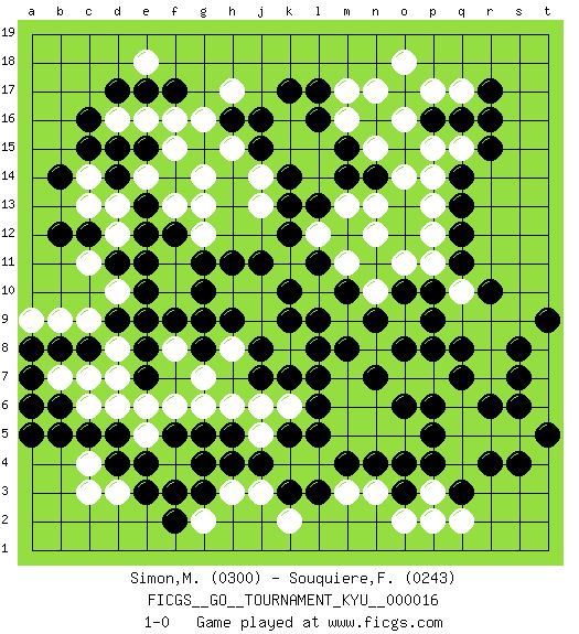 Last move : 1-0 2007 March 27 13:14:37 [Event "FICGS__GO__TOURNAMENT_KYU__000016"] [Site "FICGS"] [Date "2006.12.23"] [Round "1"] [Black "Simon,Mickael"] [White "Souquiere,Florence"] [Result "1-0"] [Rating 1 "0300"] [Rating 2 "0243"] 1.r17 c4 2.d17 q4 3.r6 d10 4.e3 f4 5.e4 e5 6.f5 f6 7.g5 g4 8.d5 e6 9.d4 g6 10.h5 d6 11.c5 h6 12.h4 h3 13.g3 f3 14.f2 c6 15.b6 b7 16.b5 q10 17.k17 k16 18.l17 p15 19.q14 p14 20.q13 p13 21.q12 p12 22.q11 p11 23.r10 q6 24.q7 j5 25.j4 d16 26.c16 m5 27.l16 l15 28.m15 p7 29.q8 n15 30.m14 m13 31.l13 l12 32.m12 n13 33.k13 j13 34.j16 k15 35.j15 m11 36.k12 n12 37.p8 n8 38.j11 j10 39.k10 j9 40.h11 h10 41.g11 m17 42.n16 f11 43.g10 f10 44.f9 f8 45.e9 g9 46.g8 g7 47.h9 h8 48.g9 n3 49.k5 j6 50.l7 k6 51.j8 k4 52.l5 l4 53.l6 g13 54.k9 l14 55.k14 p17 56.q16 o5 57.d9 c9 58.c8 b9 59.b8 r5 60.s6 h15 61.h16 g14 62.a7 c7 63.e8 l10 64.f12 g12 65.e12 f13 66.d14 d12 67.e13 s5 68.p10 m6 69.o10 j3 70.o15 t6 71.s7 k2 72.p16 n10 73.o8 l8 74.k7 k8 75.j7 m7 76.l9 o16 77.o17 o9 78.m8 m9 79.l8 e14 80.e10 g2 81.n7 o11 82.p9 d7 83.n9 c11 84.m10 q15 85.r15 o14 86.n14 d8 87.a8 d13 88.e11 e18 89.n11 o7 90.p6 n10 91.l11 n6 92.o6 c3 93.p5 j14 94.p4 c14 95.d15 p3 96.m4 n5 97.n4 o4 98.o3 o2 99.o4 f4 100.f3 m3 101.g4 t7 102.s8 e16 103.e15 f16 104.c15 f15 105.q3 p2 106.r4 q5 107.s4 g16 108.d11 t8 109.t9 n17 110.c12 a6 111.a5 c13 112.b12 o18 113.b14 d3 114.e7 h17 115.e17 q2 116.t5 o16 117.f17 a9 118.a6 n15 119.l3 m16 120.k3 q17 121.r16 1-0 Here are the names of the openings (joseki) played in the four corners : Corner q4 : q4 r6 Hoshi (Hwajeom, Seongjeom, Xingwei`) 4-4 Point. The star or hoshi (4-4) point, emphasizing influence at the potential expense of territory. Ikken Kakari (Hankan Keolch'im, Yi Gua`jiao~, 1-Space Low Approach). Black 2 is the standard approach move to the 4-4. Corner d4 : c4 e3 Komoku (Somok, Xiao~mu`) 3-4 Point. The komoku (3-4) point is the traditional corner enclosure move.. Ikken Kakari (Hankan Keolch'im, Yi Gua`jiao~, 1-Space Low Pincer). The small knight move is the basic approach move to the 3-4 point stone. It has been continually used for over four centuries. There are limitless variations, with new moves constantly being discovered. Black 2 opens the door to a treaure store of joseki. Corner d16 : d17 d16 Komoku (Somok, Xiao~mu`) 3-4 Point. The komoku (3-4) point is the traditional corner enclosure move.. Player Black won this Go (weiqi, baduk) game. Follow this game move after move (download)Empty triangles are bad. (Anonymous) The message for business people contemplating their place in the cyberspace is simple and direct: get linked or get lost. (Vic Sussman and Kenan Pollack)