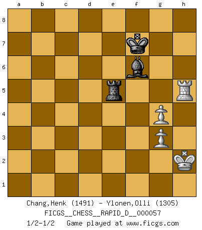 Last move : 1/2-1/2 2011 September 5 12:47:3 [Event "FICGS__CHESS__RAPID_D__000057"] [Site "FICGS"] [Date "2011.05.19"] [Round "1"] [White "Chang,Henk"] [Black "Ylonen,Olli"] [Result "1/2-1/2"] [WhiteElo "1491"] [BlackElo "1305"] 1.d4 Nf6 2.Nf3 g6 3.c4 Bg7 4.Nc3 O-O 5.e4 d6 6.Be2 e5 7.O-O Nbd7 8.Bg5 h6 9.Bh4 g5 10.Bg3 Nh5 11.dxe5 Nxg3 12.hxg3 dxe5 13.Qc2 c6 14.Rad1 Qc7 15.Rd2 Nc5 16.Rfd1 Ne6 17.b4 Nd4 18.Nxd4 exd4 19.Na4 Re8 20.Nb2 a5 21.a3 axb4 22.axb4 Ra3 23.Rd3 Rxd3 24.Bxd3 Be6 25.Na4 Ra8 26.Nc5 b6 27.Nxe6 fxe6 28.c5 bxc5 29.Qxc5 Be5 30.Rc1 Ra3 31.Bc4 Qd6 32.Qxd6 Bxd6 33.Bxe6+ Kf8 34.Rxc6 Bxb4 35.Bg4 Ra1+ 36.Kh2 d3 37.Rxh6 d2 38.Rg6 Be7 39.f4 d1Q 40.Bxd1 Rxd1 41.e5 Rf1 42.fxg5 Kf7 43.Rh6 Bxg5 44.Rh5 Rf5 45.g4 Rxe5 46.g3 Bf6 1/2-1/2 King's Indian : East Indian defense Kingside Castling by player Black (move 4) Kingside Castling by player White (move 7) Promotion Queen by player Black (move 39) 10 pieces endgame at move 40 : White KRPPPP , Black KRBP WHITE : King + 1 Rook 4 Pawns BLACK : King + 1 Rook 1 Bishop 1 Pawn 9 pieces endgame at move 42 : White KRPPPP , Black KRB WHITE : King + 1 Rook 4 Pawns BLACK : King + 1 Rook 1 Bishop 8 pieces endgame at move 43 : White KRPPP , Black KRB WHITE : King + 1 Rook 3 Pawns BLACK : King + 1 Rook 1 Bishop 7 pieces endgame at move 45 : White KRPP , Black KRB WHITE : King + 1 Rook 2 Pawns BLACK : King + 1 Rook 1 Bishop This chess game ended in a draw. Follow this game move after move (download)I have never in my life played the French Defence, which is the dullest of all openings. (Wilhelm Steinitz) Habe Mut, dich deines eigenen Verstandes zu bedienen. (Immanuel Kant) Yo nunca en mi vida he jugado la Defensa Francesa, que viene siendo la más aburrida de todas las Aperturas. (Wilhelm Steinitz) A chaque perte on perd un peu de soi. (Joël Lautier) To err is human, but to really foul things up requires a computer. (Farmer's Almanac, 1978)