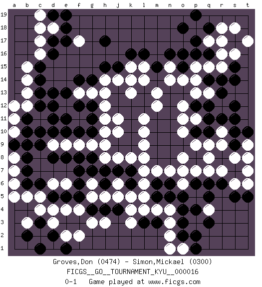 Last move : 0-1 2007 April 6 2:59:14 [Event "FICGS__GO__TOURNAMENT_KYU__000016"] [Site "FICGS"] [Date "2006.12.23"] [Round "1"] [Black "Groves,Don"] [White "Simon,Mickael"] [Result "0-1"] [Rating 1 "0474"] [Rating 2 "0300"] 1.q3 d4 2.d16 r16 3.p17 q15 4.n16 r10 5.r6 k3 6.c10 g3 7.m3 f17 8.h17 c17 9.d17 c16 10.c15 b15 11.c14 b14 12.c13 d18 13.e18 c18 14.e17 o10 15.c6 c4 16.d8 n14 17.l16 l5 18.m5 l6 19.m6 m7 20.r8 n7 21.n6 o6 22.o5 m4 23.n5 n4 24.p6 o7 25.o4 n3 26.o3 n2 27.o2 l14 28.j15 j14 29.h15 h14 30.g14 g13 31.f14 f13 32.e13 e12 33.d13 f11 34.f8 g9 35.h7 j8 36.j7 k8 37.k7 l7 38.h4 h3 39.j4 k4 40.g4 f4 41.f5 e4 42.e5 q17 43.p16 p15 44.h9 h8 45.j9 f9 46.g8 e9 47.e8 d9 48.c9 c11 49.k9 l8 50.k12 l10 51.k10 l11 52.k11 k13 53.l12 m12 54.l13 m13 55.j13 k14 56.h13 h12 57.j12 h11 58.d11 b13 59.e11 h10 60.d12 l9 61.b11 c5 62.b6 p18 63.o18 d6 64.e10 j10 65.f10 j11 66.q18 r18 67.p19 e6 68.d5 g5 69.f6 g6 70.f7 j5 71.g7 j6 72.r11 r9 73.r14 r15 74.s14 r12 75.s11 s8 76.q12 q13 77.r13 p13 78.s15 s16 79.q10 q9 80.s10 r7 81.q8 q7 82.p8 p7 83.s9 p9 84.p10 o8 85.p12 o12 86.q6 s6 87.s5 t7 88.t5 b12 89.c12 k15 90.k16 b5 91.f12 a6 92.b7 a7 93.b8 a8 94.a9 a5 95.s17 s18 96.r17 t17 97.q16 r17 98.o15 o14 99.g11 o1 100.p1 n1 101.p2 n15 102.o16 o11 103.k6 k5 104.h6 h5 105.m15 p11 106.q11 t9 107.s12 t6 108.t10 t8 109.c3 d3 110.d2 e2 111.b2 d1 112.c1 c2 113.l3 l4 114.d2 p5 115.q5 c2 116.r8 q8 117.d2 q4 118.p4 c2 119.g12 h13 120.d2 b3 121.e1 f2 122.q14 p14 123.g10 a10 124.b9 a11 125.d10 h9 126.b10 a12 127.d19 c19 128.e19 l15 0-1 Here are the names of the openings (joseki) played in the four corners : Corner q16 : r16 p17 Komoku (Somok, Xiao~mu`) 3-4 Point. The komoku (3-4) point is the traditional corner enclosure move.. Ikken Kakari (Hankan Keolch'im, Yi Gua`jiao~, 1-Space Low Pincer). The small knight move is the basic approach move to the 3-4 point stone. It has been continually used for over four centuries. There are limitless variations, with new moves constantly being discovered. Black 2 opens the door to a treaure store of joseki. Corner d16 : d16 f17 Hoshi (Hwajeom, Seongjeom, Xingwei`) 4-4 Point. The star or hoshi (4-4) point, emphasizing influence at the potential expense of territory. Ikken Kakari (Hankan Keolch'im, Yi Gua`jiao~, 1-Space Low Approach). White 2 is the standard approach move to the 4-4. Player White won this Go (weiqi, baduk) game. Follow this game move after move (download)Territory is a closed space where time no longer exists. The transformation around it slower alter it, and sometimes it cracks open like a rotten egg at the least shock. (Pierre Audouard) A specialist learns more and more about less and less until he knows everything about nothing. (Nicholas Murray Butler)