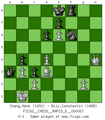 Last move : 0-1 2011 June 17 22:40:20 [Event "FICGS__CHESS__RAPID_D__000057"] [Site "FICGS"] [Date "2011.05.19"] [Round "1"] [White "Chang,Henk"] [Black "Bilz,Constantin"] [Result "0-1"] [WhiteElo "1491"] [BlackElo "1488"] 1.e4 d6 2.d4 Nf6 3.Nc3 g6 4.Be3 c6 5.Nf3 Bg7 6.Be2 b5 7.a3 O-O 8.h3 Qc7 9.Qd2 Bb7 10.Bh6 Nbd7 11.Bxg7 Kxg7 12.O-O-O a5 13.h4 b4 14.axb4 axb4 15.Nb1 Nxe4 16.Qe3 c5 17.h5 Ndf6 18.hxg6 fxg6 19.Qh6+ Kg8 20.Ng5 Nxg5 21.Qxg5 c4 22.Rxh7 Kxh7 23.Rh1+ Kg7 24.Rh6 Be4 25.f3 Ra5 26.Qh4 c3 27.b3 Qa7 28.fxe4 Ra1 29.Bd3 Rxb1+ 30.Kxb1 Qa3 31.Rxg6+ Kxg6 32.e5 Kf7 33.e6+ Ke8 0-1 Pirc defense Kingside Castling by player Black (move 7) Queenside Castling by player White (move 12) Player Black won this chess game. Follow this game move after move (download)Strategy requires thought, tactics require observation. (Max Euwe) Schach ist gnadenlos. Du mußt bereit sein zu töten. (Nigel Short) Cada Peón es una Reina en potencia. (James Mason) Les pièces de l'échiquier étaient impitoyables. Elles le retenaient, elles l'absorbaient. Il y avait de l'horreur en cela, mais aussi une harmonie unique. Car, qu'y a-t-il dans le monde, à part les échecs ? (V. Nabokov) Philosophers use a language that is already deformed as though by shoes that are too tight. (Ludwig Wittgenstein)