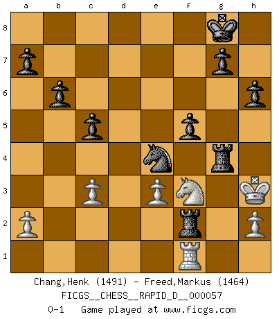 Last move : 0-1 2011 June 19 19:7:23 [Event "FICGS__CHESS__RAPID_D__000057"] [Site "FICGS"] [Date "2011.05.19"] [Round "1"] [White "Chang,Henk"] [Black "Freed,Markus"] [Result "0-1"] [WhiteElo "1491"] [BlackElo "1464"] 1.d4 d5 2.c4 e6 3.Nc3 Nf6 4.Bg5 Be7 5.e3 O-O 6.Nf3 h6 7.Bh4 Ne4 8.Bxe7 Qxe7 9.Bd3 Nxc3 10.bxc3 dxc4 11.Bxc4 Nd7 12.O-O b6 13.Qc2 Bb7 14.Qe2 Qa3 15.Rac1 c5 16.Rfd1 Rac8 17.d5 exd5 18.Bxd5 Bxd5 19.Rxd5 Qxc1+ 20.Qf1 Qxf1+ 21.Kxf1 Nf6 22.Rd1 Rfd8 23.Re1 Rd3 24.Rc1 Rcd8 25.Ke2 Ne4 26.Ne5 Rd2+ 27.Kf3 Rxf2+ 28.Kg4 Rxg2+ 29.Kh3 R8d2 30.Rh1 f5 31.Nf3 Rg4 32.Rf1 Rf2 0-1 QGD : Lasker defense Kingside Castling by player Black (move 5) Kingside Castling by player White (move 12) Player Black won this chess game. Follow this game move after move (download)I won't play with you anymore. You have insulted my friend. - When an opponent cursed himself for a blunder. (Miguel Najdorf) Ja, ich habe einmal eine Blitzpartie gespielt, es war in einem Zug, 1929. --im Interview 1989 (Mikhail Moiseyevich Botvinik) Si el Ajedrez es una ciencia, es la mas inexacta. Si el Ajedrez es un arte, es demasiado inexacto para ser visto como tal. Si el Ajedrez es un deporte, es demasiado esotérico. Si el Ajedrez es un juego, es demasiado exigente para ser solo un juego. Si el Ajedrez es una aventura, es una muy demandante. Si el Ajedrez es una pasión, es una muy gratificante. Si el Ajedrez es la vida, es una muy triste. (Anónimo) Vous m'avez demandé de vous exposer quel est le fondement de la prière. Je ne fais que préparer les pièces du jeu sur la table... Nous sera-t-il permis d'en adopter les règles et si nous les appliquons scrupuleusement nous ne tarderons pas à faire mat le Roi divin ! Il ne pourra échapper à nos mains. (Sainte Thérèse d'Avila, Chemin de perfection) Follow your passion, and success will follow you. (Arthur Buddhold)