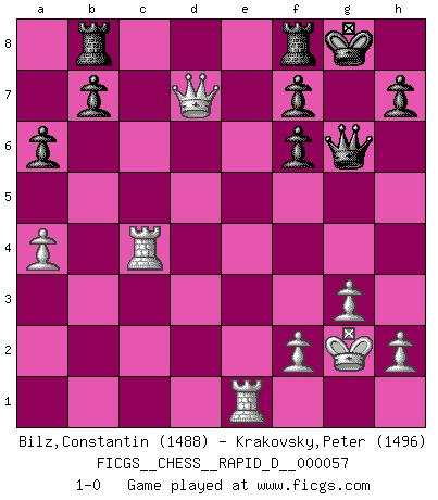 Last move : 1-0 2011 September 3 10:17:17 [Event "FICGS__CHESS__RAPID_D__000057"] [Site "FICGS"] [Date "2011.05.19"] [Round "1"] [White "Bilz,Constantin"] [Black "Krakovsky,Peter"] [Result "1-0"] [WhiteElo "1488"] [BlackElo "1496"] 1.Nf3 Nf6 2.g3 d5 3.Bg2 e6 4.c4 Be7 5.d4 O-O 6.O-O dxc4 7.Qc2 a6 8.a4 Bd7 9.Qxc4 Bc6 10.Bg5 Bd5 11.Qd3 c5 12.Nc3 Bc6 13.Rfd1 cxd4 14.Nxd4 Bxg2 15.Kxg2 Nbd7 16.Qf3 Rb8 17.Nf5 exf5 18.Bxf6 Bxf6 19.Qxf5 Qb6 20.Qxd7 Qxb2 21.Nd5 Qxe2 22.Re1 Qc2 23.Nxf6+ gxf6 24.Rac1 Qg6 25.Rc4 1-0 This chess game has been lost on time (started : 2011.05.19 18:13:45) Reti Opening Kingside Castling by player Black (move 5) Kingside Castling by player White (move 6) Player White won this chess game. Follow this game move after move (download)For me, Chess is life and every game is like a new life. Every Chess player gets to live many lives in one lifetime. (Eduard Gufeld) Wer mein Gambit spielt, muß bereit sein, alle Brücken hinter sich abzubrechen. Es verändert den ganzen Menschen. Es wirkt wie ein Zauberstab und fördert verkümmerte, gute Charakter- eigenschaften wieder zu Tage. (Emil Joseph Diemer) Yo siempre he tenido un ligero sentimiento de lástima por una persona que no tiene conocimiento del Ajedrez. (Siegbert Tarrasch) Aux échecs, les retours au sommet sont rares : les dommages psychologiques consécutifs à une défaite sont trop sévères. (Daily Telegraph) Memory is a crazy woman that hoards colored rags and throws away food. (Austin O'Malley)