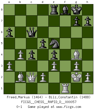 Last move : 0-1 2011 September 7 10:21:34 [Event "FICGS__CHESS__RAPID_D__000057"] [Site "FICGS"] [Date "2011.05.19"] [Round "1"] [White "Freed,Markus"] [Black "Bilz,Constantin"] [Result "0-1"] [WhiteElo "1464"] [BlackElo "1488"] 1.b3 e5 2.Bb2 Nc6 3.e3 Nf6 4.Nf3 e4 5.Nd4 Nxd4 6.Bxd4 Be7 7.c4 O-O 8.Qc2 c5 9.Bb2 b5 10.cxb5 Bb7 11.g3 d5 12.Bg2 a6 13.Nc3 Qa5 14.b6 Qxb6 15.O-O Nd7 16.Rac1 Rac8 17.f3 f5 18.fxe4 fxe4 19.Bh3 Qd6 20.Ne2 Rce8 21.Rxf8+ Bxf8 22.b4 c4 23.Rf1 Bc6 24.Nd4 Qh6 25.Kg2 Ne5 26.a3 Nf3 27.Nxc6 Qxc6 28.Bg4 Ne5 0-1 This chess game has been lost on time (started : 2011.05.19 18:13:45) Nimzovich-Larsen attack : Modern variation Kingside Castling by player Black (move 7) Kingside Castling by player White (move 15) Player Black won this chess game. Follow this game move after move (download)If one piece is badly posted, the whole game is bad. (Tarrasch) Der Schachmeister von Heute braucht Courage, einen Killerinstinkt, Ausdauer und Arroganz. (Larry Evans) El Ajedrez es un terrible juego. Si no controlas el centro, tu oponente tiene una posición mas holgada. Si tienes control del centro, ¡entonces realmente tu tienes algo de que preocuparte!. (Siegbert Tarrasch) Les Echecs sont affaire de jugement sensible. Savoir quand frapper et quand esquiver. (Fischer) Tree pose grows confidence. It roots me to this world. (Terri Guillemets)