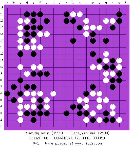 Last move : 0-1 2011 October 25 17:21:28 [Event "FICGS__GO__TOURNAMENT_KYU_III__000019"] [Site "FICGS"] [Date "2011.05.20"] [Round "1"] [Black "Praz,Sylvain"] [White "Huang,Yen-Wei"] [Result "0-1"] [Rating 1 "1993"] [Rating 2 "2130"] 1.r16 d17 2.q3 c3 3.d15 c15 4.d16 c16 5.e17 c14 6.d18 c17 7.l17 q5 8.r7 p6 9.n3 r3 10.r2 r4 11.r10 s2 12.k3 f17 13.f18 e16 14.e18 f15 15.g17 d6 16.f16 g15 17.e15 e14 18.d14 d13 19.e16 f13 20.e12 e13 21.q2 p16 22.q14 r17 23.s17 q17 24.s18 n17 25.o14 n15 26.o15 o16 27.m16 l18 28.k18 m18 29.k17 n16 30.c12 c13 31.c8 c10 32.c6 c5 33.d7 b6 34.b7 c7 35.o7 n4 36.m4 q8 37.r8 m5 38.o4 n5 39.l4 q9 40.c6 o3 41.d5 c7 42.o5 o6 43.c6 e6 44.b5 c7 45.n6 p4 46.c6 c4 47.a6 e4 48.f5 e5 49.o2 p5 50.g3 n2 51.m3 p2 52.e2 d9 53.d3 c2 54.e3 d4 55.e7 f6 56.e9 e10 57.f9 f10 58.g9 g5 59.q10 p10 60.p11 o10 61.f4 g4 62.f3 h6 63.l14 r9 64.s9 s10 65.s8 q11 66.r11 q12 67.o12 s11 0-1 Here are the names of the openings (joseki) played in the four corners : Corner d16 : d17 d15 Komoku (Somok, Xiao~mu`) 3-4 Point. The komoku (3-4) point is the traditional corner enclosure move.. Ikken Takagakari (Hankan Nop'dakeolch'im, Yi Gaogua`jiao~, 1-Space High Approach). The 5-4 approach move has become more popular in modern times, as modern Go emphasizes speed and influence. Corner q4 : q3 q5 Komoku (Somok, Xiao~mu`) 3-4 Point. The komoku (3-4) point is the traditional corner enclosure move.. Ikken Takagakari (Hankan Nop'dakeolch'im, Yi Gaogua`jiao~, 1-Space High Approach). The 5-4 approach move has become more popular in modern times, as modern Go emphasizes speed and influence. Player White won this Go (weiqi, baduk) game. Follow this game move after move (download)If you cannot succeed, then die gloriously. (Chinese proverb) Hold em is to stud what chess is to checkers. (Johnny Moss)