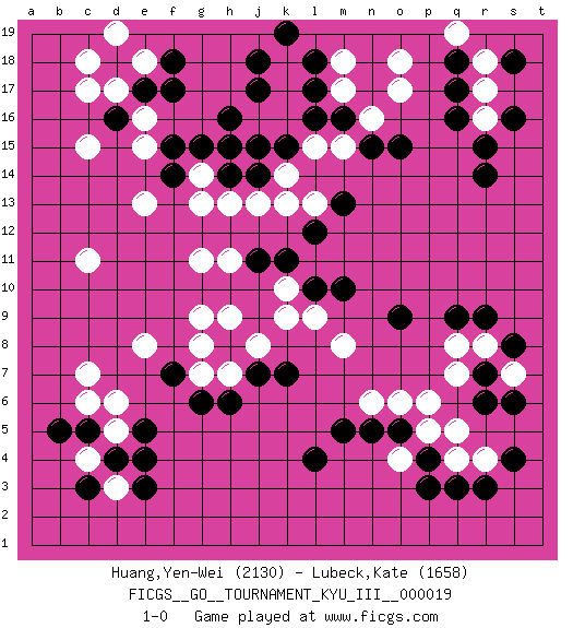 Last move : 1-0 2011 September 7 22:56:17 [Event "FICGS__GO__TOURNAMENT_KYU_III__000019"] [Site "FICGS"] [Date "2011.05.20"] [Round "1"] [Black "Huang,Yen-Wei"] [White "Lubeck,Kate"] [Result "1-0"] [Rating 1 "2130"] [Rating 2 "1658"] 1.q16 c4 2.q3 d17 3.e3 d3 4.e4 c11 5.c5 d5 6.d4 c6 7.b5 c7 8.e5 d6 9.c3 o17 10.r14 k16 11.l4 c15 12.q9 r4 13.r3 q4 14.p4 p5 15.o5 o4 16.p3 o6 17.n5 p6 18.r6 q5 19.o9 r8 20.r9 q7 21.s8 s7 22.r7 q8 23.s6 n6 24.m5 m8 25.m10 l9 26.l10 k9 27.j11 k10 28.k11 g9 29.q18 o18 30.o15 g11 31.d18 e18 32.e17 c18 33.d16 c17 34.f18 d19 35.g15 h13 36.j15 k14 37.j14 j13 38.k15 l15 39.l16 m15 40.l17 j16 41.h16 h15 42.h14 g14 43.h15 l13 44.l12 h11 45.m16 n16 46.n15 k18 47.j18 k17 48.l18 e16 49.f14 g13 50.m13 k13 51.f15 e13 52.f7 e8 53.h8 h9 54.k7 j8 55.j7 h7 56.h6 g7 57.g6 g8 58.f17 e15 59.s4 r17 60.q17 r16 61.r15 r18 62.s16 q19 63.s18 m18 64.k19 m17 65.j17 1-0 Here are the names of the openings (joseki) played in the four corners : Corner d4 : c4 e3 Komoku (Somok, Xiao~mu`) 3-4 Point. The komoku (3-4) point is the traditional corner enclosure move.. Ikken Kakari (Hankan Keolch'im, Yi Gua`jiao~, 1-Space Low Pincer). The small knight move is the basic approach move to the 3-4 point stone. It has been continually used for over four centuries. There are limitless variations, with new moves constantly being discovered. Black 2 opens the door to a treaure store of joseki. Corner q16 : q16 o17 Hoshi (Hwajeom, Seongjeom, Xingwei`) 4-4 Point. The star or hoshi (4-4) point, emphasizing influence at the potential expense of territory. Ikken Kakari (Hankan Keolch'im, Yi Gua`jiao~, 1-Space Low Approach). White 2 is the standard approach move to the 4-4. Player Black won this Go (weiqi, baduk) game. Follow this game move after move (download)The intersection is rarely neutral. (Pierre Audouard) The hypothalamus is one of the most important parts of the brain, involved in many kinds of motivation, among other functions. The hypothalamus controls the 'Four Fs: Fighting, Fleeing, Feeding and Mating. (Unknown author)