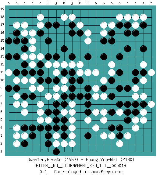 Last move : 0-1 2012 January 7 22:54:27 [Event "FICGS__GO__TOURNAMENT_KYU_III__000019"] [Site "FICGS"] [Date "2011.05.20"] [Round "1"] [Black "Guanter,Renato"] [White "Huang,Yen-Wei"] [Result "0-1"] [Rating 1 "1957"] [Rating 2 "2130"] 1.d4 q3 2.q16 c17 3.q5 r5 4.r6 r4 5.q7 o3 6.r11 o17 7.q14 c6 8.f3 b4 9.c11 c3 10.d3 q18 11.c15 e17 12.l3 c13 13.c8 c7 14.d8 e6 15.d13 d14 16.c14 d12 17.b13 e13 18.c12 r17 19.r16 l16 20.j17 k17 21.g17 d15 22.h14 j18 23.j16 h18 24.k16 l15 25.f15 c16 26.e16 d16 27.f17 e18 28.e10 h12 29.f13 f12 30.g13 g12 31.j13 k11 32.l13 j3 33.h4 j4 34.h5 j5 35.h7 h6 36.g6 j6 37.f6 p6 38.q6 n6 39.o8 m11 40.n13 o11 41.n15 n16 42.o15 g2 43.f2 g3 44.g4 e5 45.f4 e7 46.j11 j12 47.g10 f5 48.g5 g8 49.g7 f8 50.h8 h9 51.k8 n8 52.l6 l5 53.m5 m6 54.l7 m4 55.p4 n5 56.p3 p2 57.j9 h10 58.k10 j7 59.j8 l11 60.c2 b2 61.c4 b3 62.g1 h2 63.h11 g11 64.j10 g9 65.l9 o9 66.e4 s6 67.s7 s5 68.p7 s8 69.p9 r8 70.q9 m8 71.l8 s10 72.o4 n3 73.o10 n10 74.n9 m9 75.p11 s12 76.s11 t11 77.r10 r9 78.r7 t7 79.s14 o12 80.p13 b8 81.b9 b7 82.h3 j2 83.o16 n17 84.p17 p18 85.s17 s18 86.q17 r18 87.o6 b10 88.a9 c10 89.b11 d10 90.d11 e9 91.e11 d9 92.e12 d13 93.b16 b17 94.a15 b14 95.b15 a14 96.a13 a11 97.f10 k12 0-1 Here are the names of the openings (joseki) played in the four corners : Corner q4 : q3 q5 Komoku (Somok, Xiao~mu`) 3-4 Point. The komoku (3-4) point is the traditional corner enclosure move.. Ikken Takagakari (Hankan Nop'dakeolch'im, Yi Gaogua`jiao~, 1-Space High Approach). The 5-4 approach move has become more popular in modern times, as modern Go emphasizes speed and influence. Corner d4 : d4 c6 Hoshi (Hwajeom, Seongjeom, Xingwei`) 4-4 Point. The star or hoshi (4-4) point, emphasizing influence at the potential expense of territory. Ikken Kakari (Hankan Keolch'im, Yi Gua`jiao~, 1-Space Low Approach). White 2 is the standard approach move to the 4-4. Corner d16 : c17 c11 San-San (Sam-Sam, San-San) 3-3 Point. The San-San (3-3) point, emphasizing territory at the expense of influence. Player White won this Go (weiqi, baduk) game. Follow this game move after move (download)The comb formation is alive. (Anonymous) A mistake is only a mistake if you let it happen twice. Otherwise it is a learning experience. (Daniel Parmet)